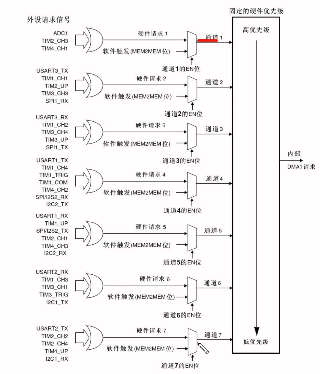 软件:每个通道的优先级可以在DMA------CCRx寄存器中设置,有4个等级:最高级>高级>中级>低级