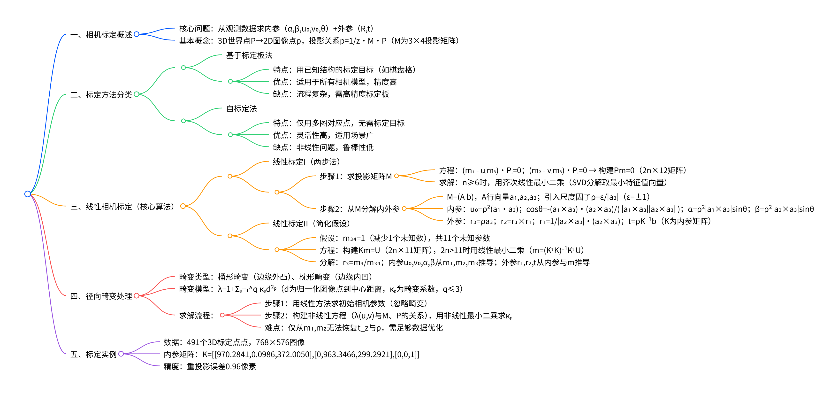 - 鲁棒性更强 :传统线性标定易受噪声影响(仅线性求解,无优化);张正友方法通过非线性最大似然估计(Levenberg-Marquardt)优化参数,且引入径向畸变修正,降低噪声干扰,重投影误差可控制在0.3像素左右。