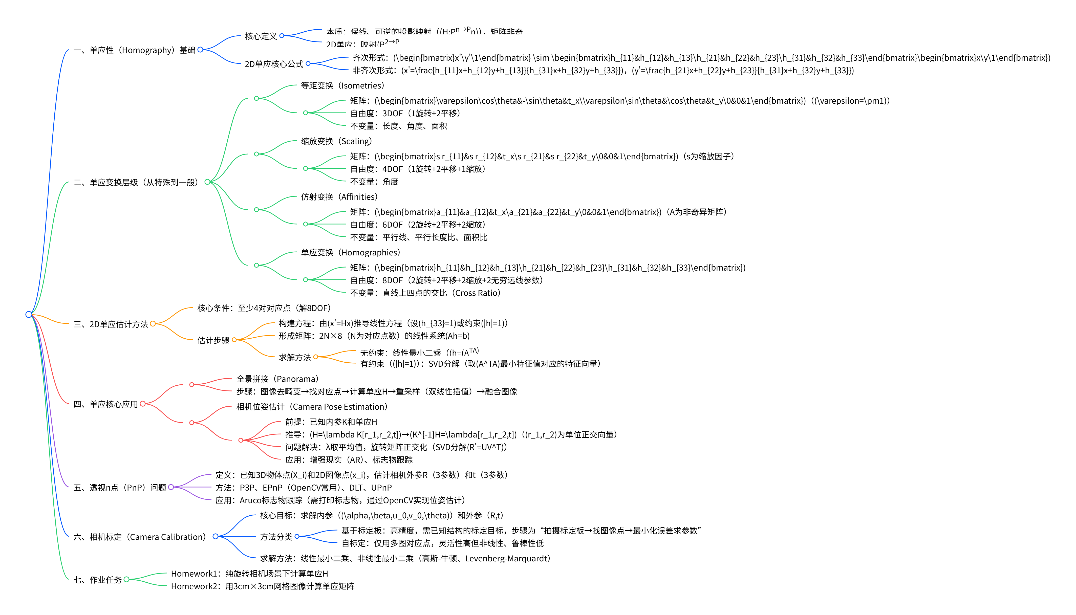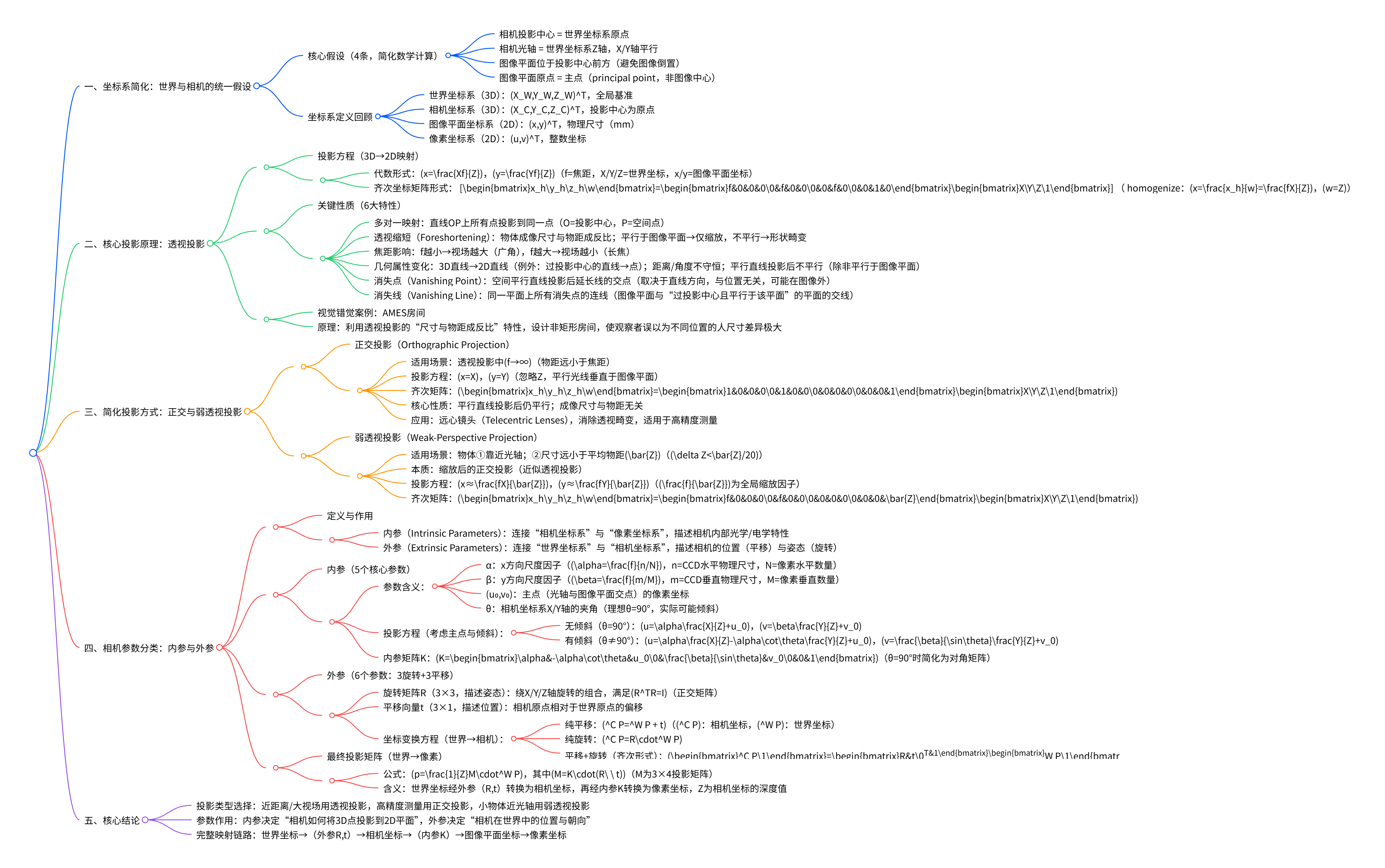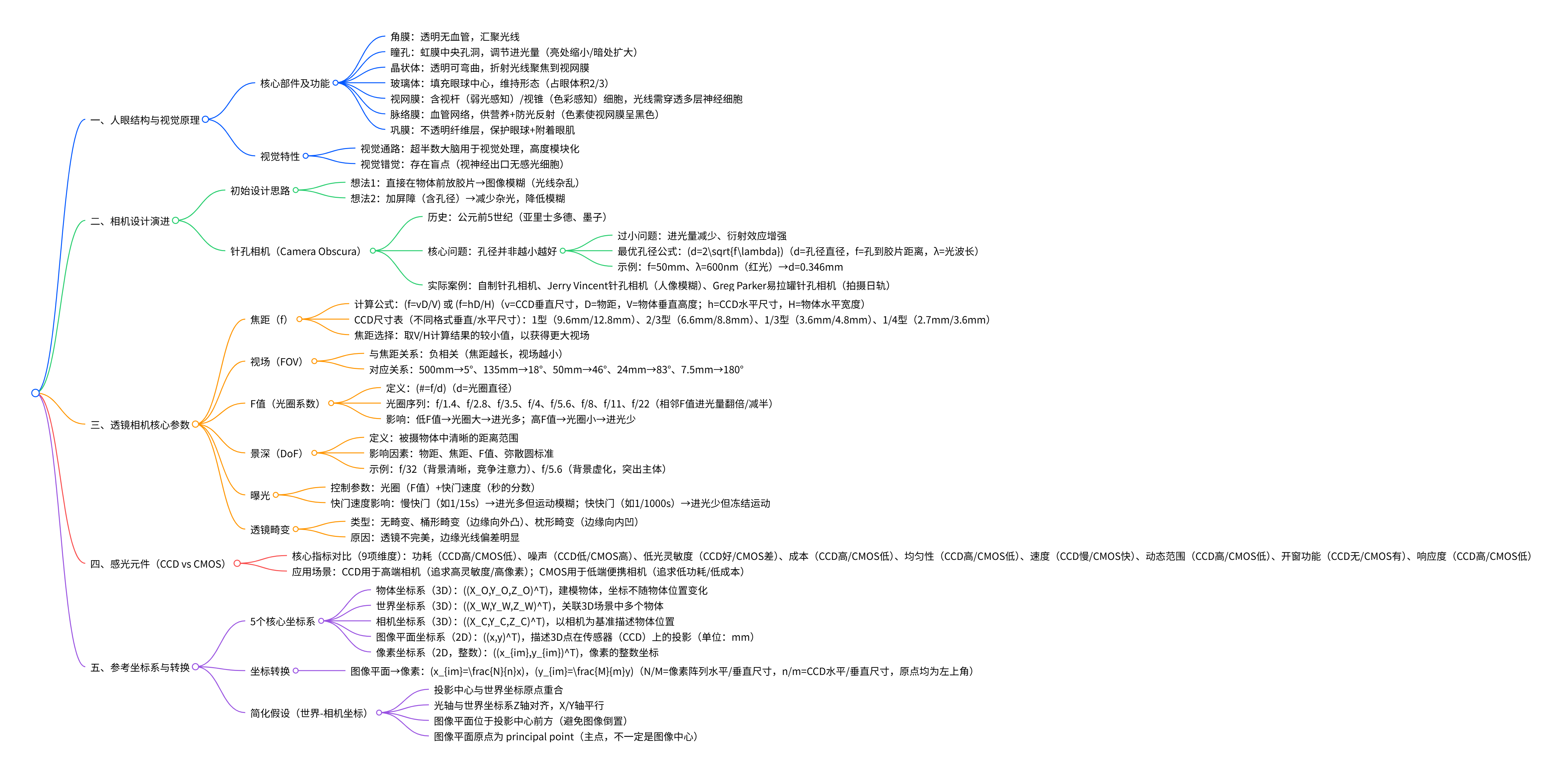 核心围绕"从人眼视觉原理到相机设计与参数"展开:先解析人眼结构 (角膜、瞳孔、晶状体等部件功能及视觉通路)与视觉特性(盲点错觉);再阐述相机设计演进(从"胶片+屏障"到针孔相机 ,给出最优孔径公式d=2fλd=2\sqrt{f\lambda}d=2fλ );随后详解透镜相机核心参数 (焦距计算f=vD/Vf=vD/Vf=vD/V或f=hD/Hf=hD/Hf=hD/H、视场与焦距负相关、F值与光圈的关系、景深影响因素、曝光的"光圈+快门速度"控制、透镜畸变类型);对比CCD与CMOS感光元件 的9项关键指标(如CCD功耗高但低光灵敏度好,CMOS成本低且速度快);最后定义5个参考坐标系(物体、世界、相机、图像平面、像素)及相互转换关系,为3D场景分析提供坐标基础。