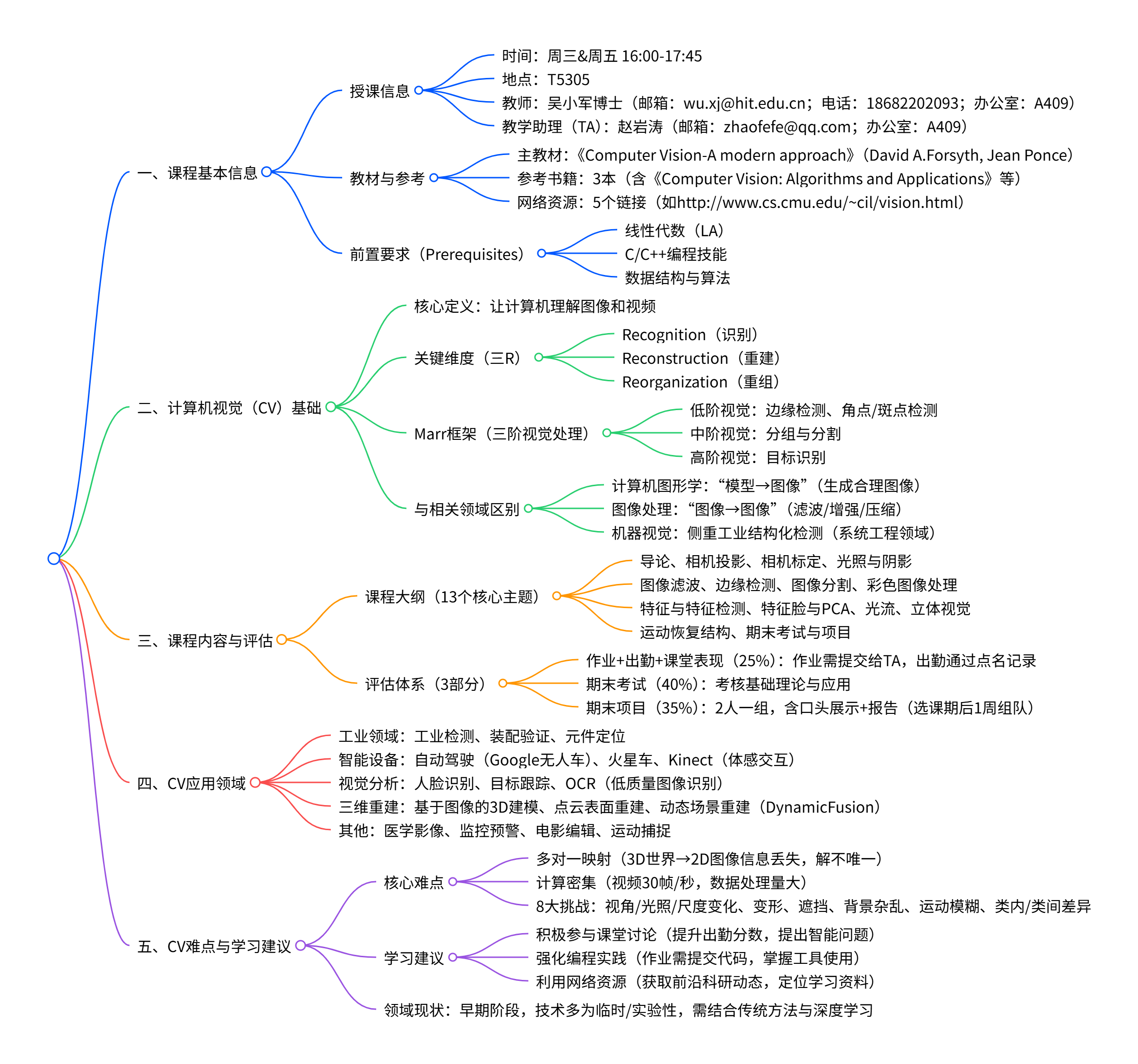 CV的定义是让计算机理解图像和视频 ,核心为"三R(Recognition、Reconstruction、Reorganization)",并通过Marr框架(低阶边缘检测、中阶分组分割、高阶识别)解析CV流程,同时列举了自动驾驶、3D重建、人脸识别等10+类应用场景 ,指出CV存在多对一映射、计算密集及视角/光照变化等8大挑战,强调其仍处于早期阶段,需结合传统方法与深度学习学习。