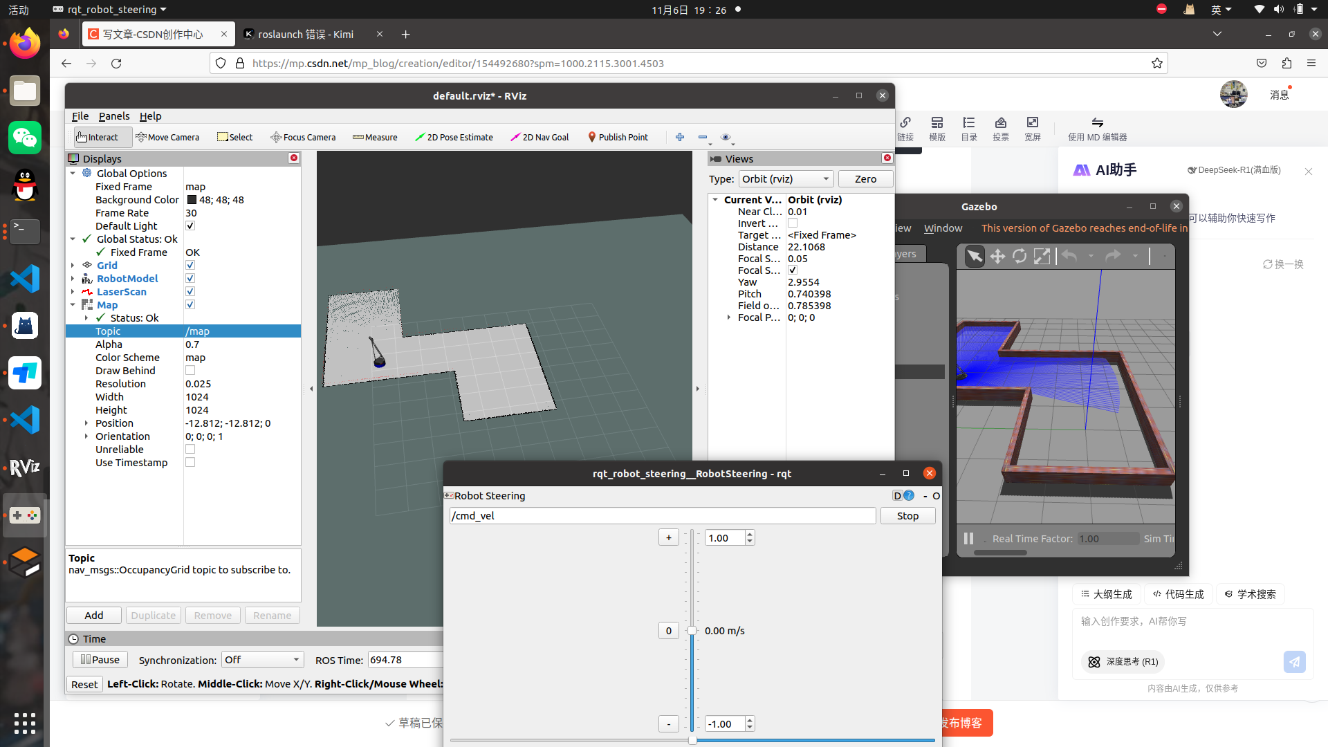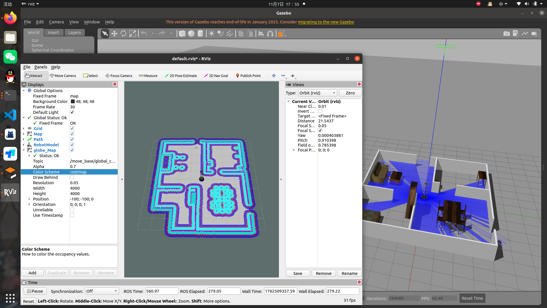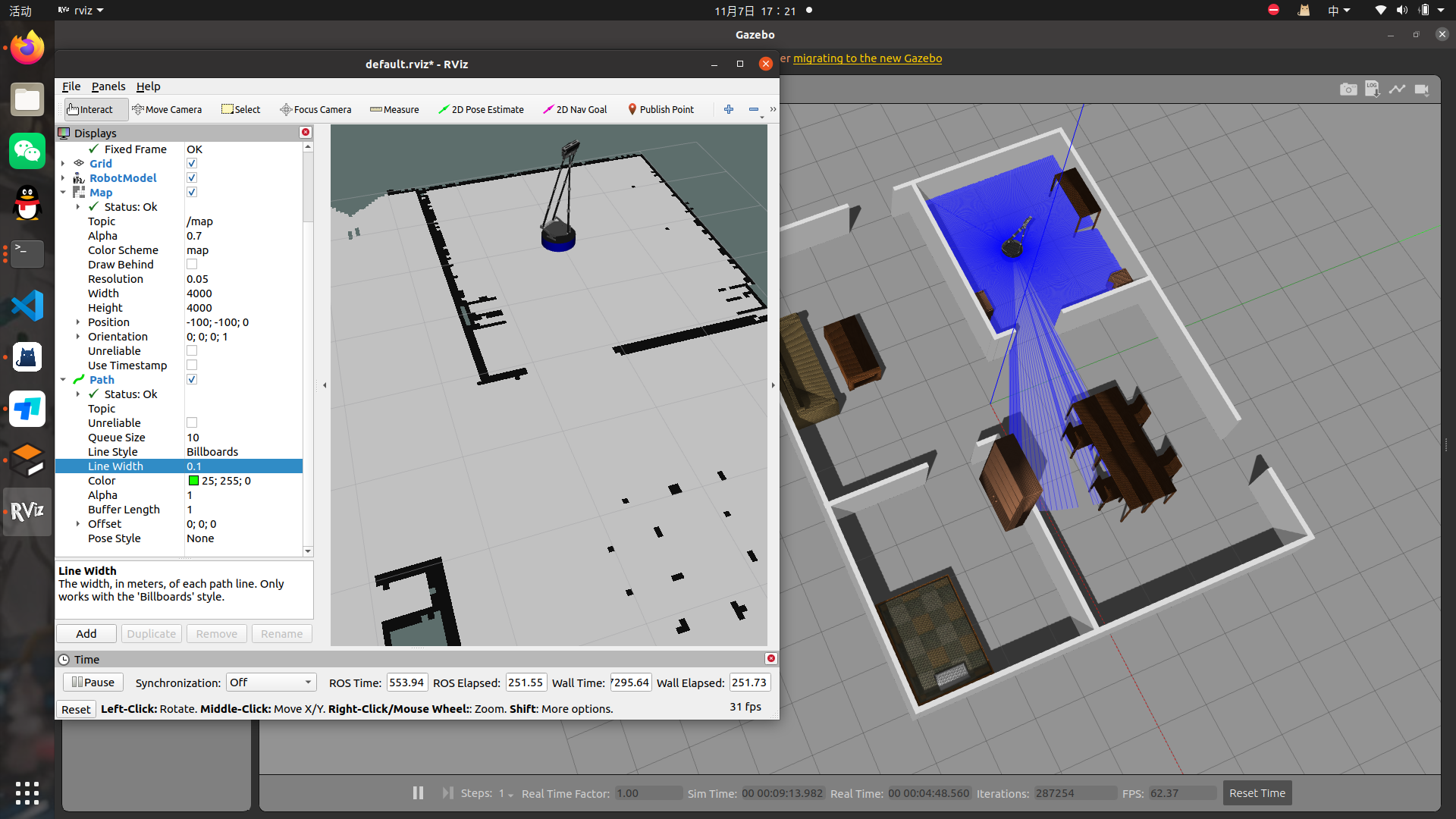 然后就实现了对应的要求,这会有一个问题就是,当机器人起点和rviz显示的不一样的时候,需重新建一个地图