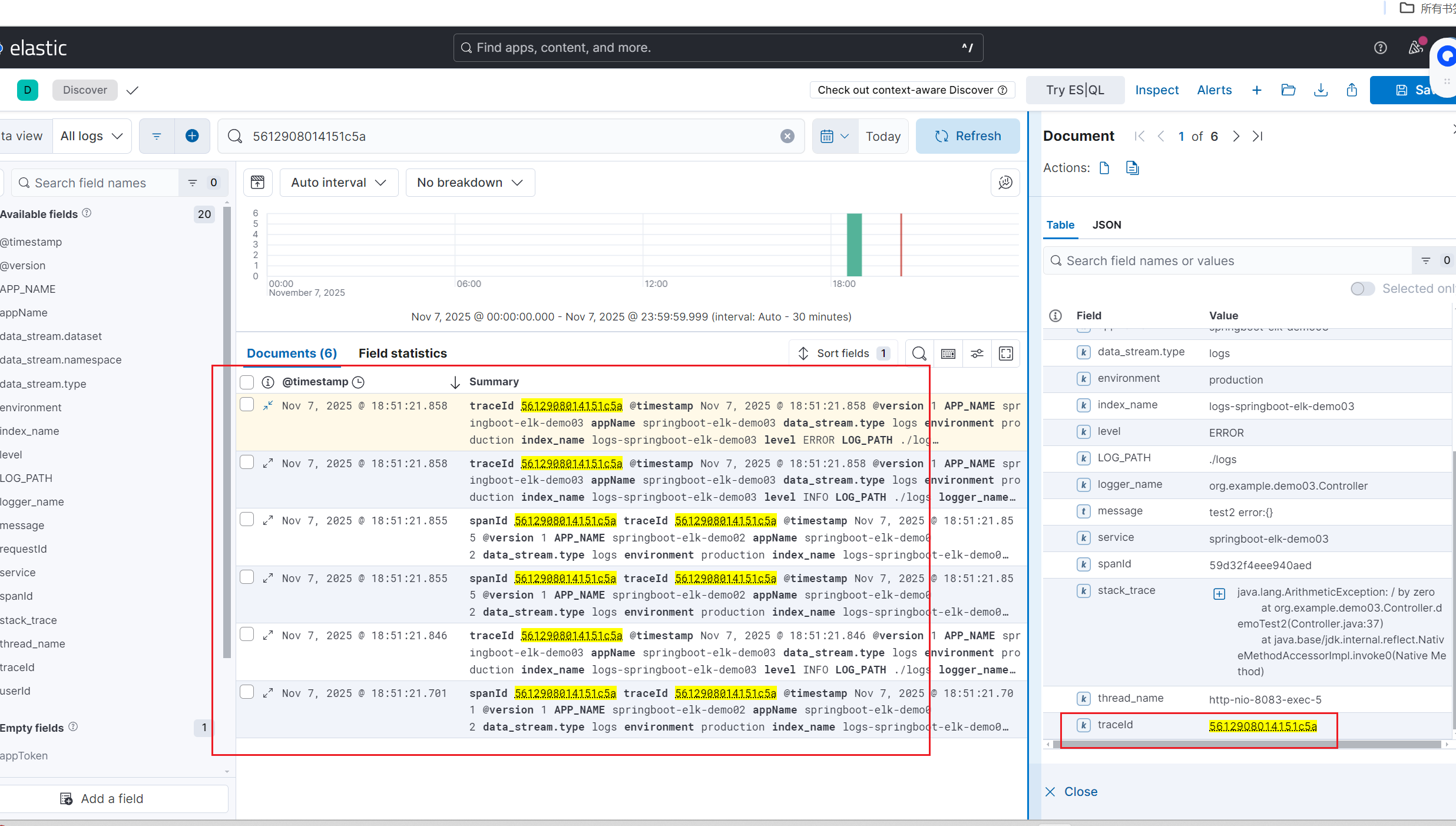 从结果可以看到,demo02和demo03的日志,而且链路id是从demo02生成然后流转到demo03,这样子就可以解决接口调用各个微服务后,可以通过统一的链路id查看同一请求不同服务之间的日志了