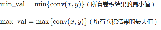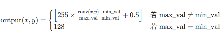- 原理:将卷积结果的动态范围(从最小值min_val到最大值max_val)线性映射到 0-255 区间,公式为: