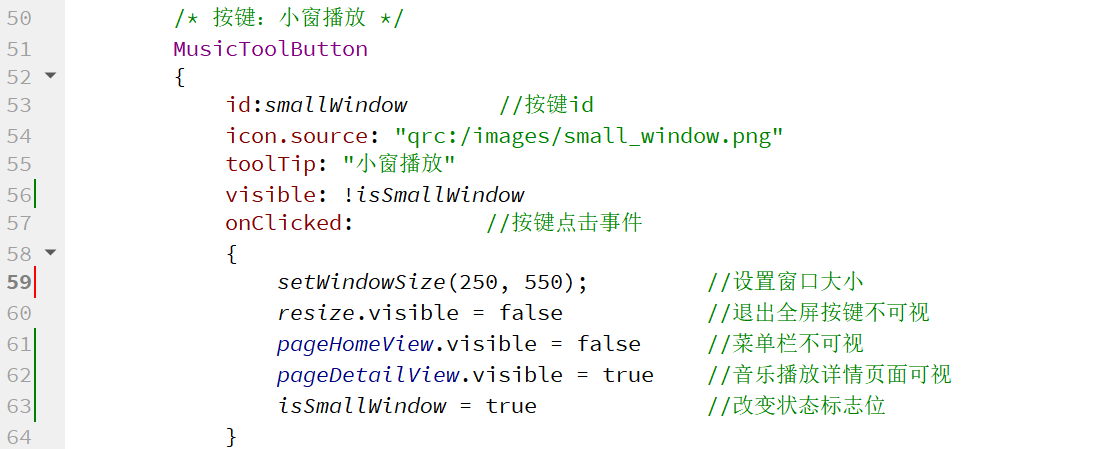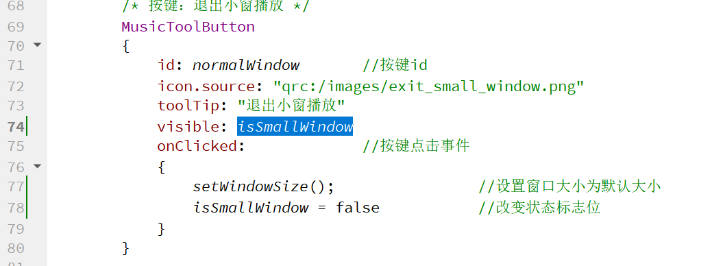 3.设置点击"小窗播放"、"退出小窗播放"按键时改变变量值isSmallWindow