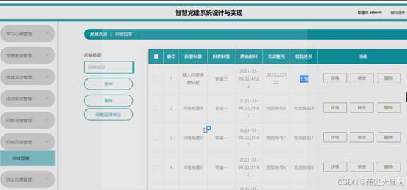 管理员点击问卷调查管理。在问卷调查页面输入问卷标题进查询、新增、删除、年龄分析或学历统计问卷调查列表,并根据需要对问卷调查详情信息进行详情操作;如图5-17所示: