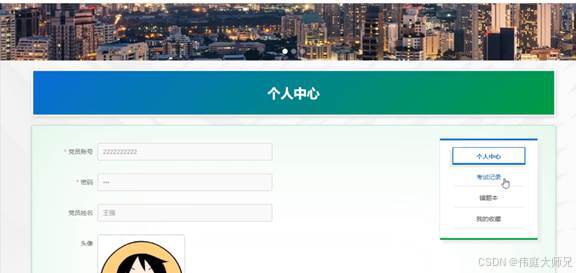 个人中心:在个人中心页面通过填写个人详细信息进行信息更新操作,还可以对考试管理、错题本、我的收藏进行详细操作;如图5-8所示: