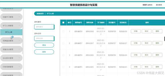 管理员点击学习心得管理。在学习心得页面输入资料编号、资料名称进行查询或删除学习心得列表,并根据需要对学习心得详情信息进行详情、修改或删除操作;如图5-15所示: