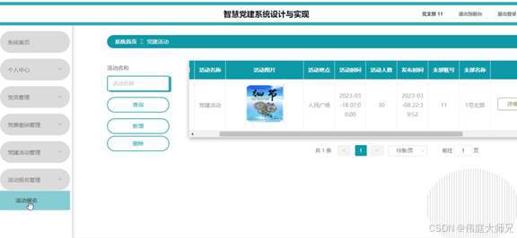 管理员点击党建活动管理。在党建活动页面输入活动名称进查询、新增或删除党建活动列表,并根据需要对党建活动详情信息进行详情操作;如图5-19所示: