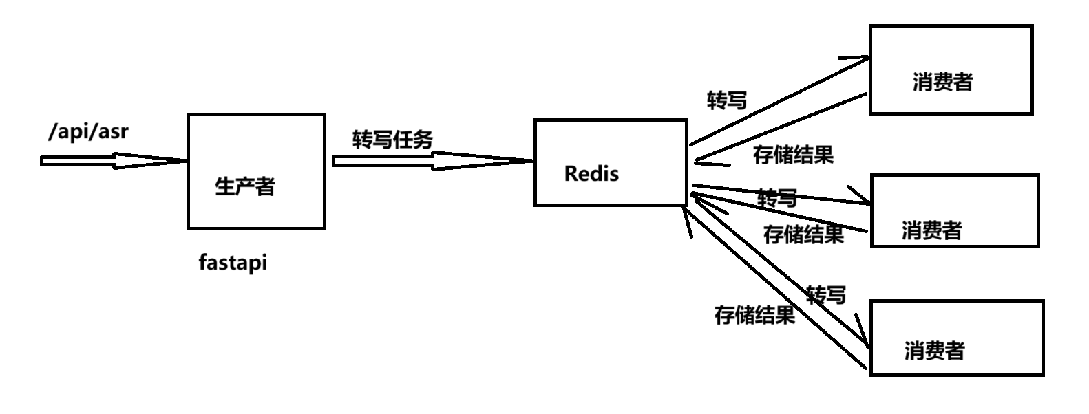 采用分布式异步执行框架Celery和消息中间件Redis(同时做为NoSQL缓存转写结果)开发而成。接口使用fastapi编写开发。总体上是生产者-消费者模型,示意图如下所示。