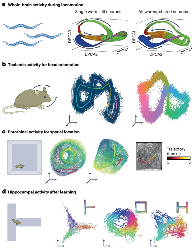 近期工作直接识别了底层神经流形:(i) 在线虫神经系统所有神经元状态中识别了与 locomotion 期间一致的低维几何结构,这些神经流形的几何结构在不同个体间高度保持,流形内位置与运动行为之间的映射也是如此;(ii) 在不同小鼠丘脑头部方向细胞中观察到一致的神经流形拓扑结构:神经群体动力学可以通过不规则环形吸引子流形描述,这种几何组织在清醒和睡眠状态间持续存在;(iii) 内嗅皮层网格细胞群体在不同环境导航期间显示出保持的环面拓扑结构,在睡眠期间也持续存在;(iv) 证据积累沿小鼠海马体中也表示在连续非线性流形上,该流形也表示空间;(v) 攻击状态与下丘脑中的线吸引子流形相关联;(vi) 非线性流形被证明能最好地捕获小鼠、猴子和人类多个皮层和下皮层运动区域与运动相关的活动。