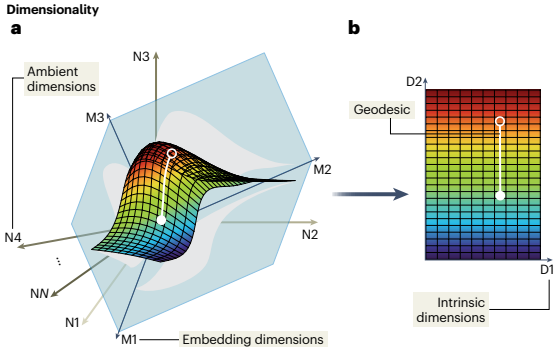 虽然神经流形通常使用降维或流形学习方法从神经群体记录中估计,但仅应用这些方法并不必然意味着神经流形作为对神经群体活动的有意义约束而存在。神经流形包含几何和动态特征,因为这两个方面紧密相连。
