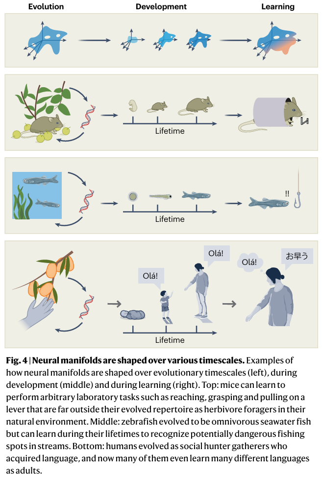 神经流形在行为和学习时间尺度上出现,受到发育和进化更长的时间尺度约束。在最长进化时间尺度上,动物获得适应,然后成为物种本能行为 repertoire 的一部分,以及它们的学习能力。这些适应在发育时间尺度上通过运行"遗传程序"表达,最终产生具有其物种基本神经回路特性的个体。这些回路特性有助于约束大脑在发育本能行为和获得新的学习行为时产生的可能活动模式,这一过程可能对形成所需的神经流形是必要的。