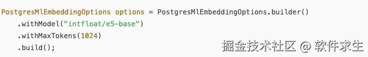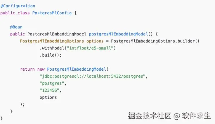 Spring Boot 会自动帮我们生成一个 PostgresMlEmbeddingModel Bean。