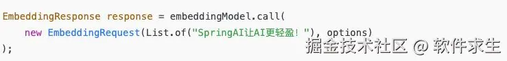 这时候,你几乎什么都不用干,SpringAI会自动帮你注入 EmbeddingModel 对象,你只需要调用 embed() 方法即可。