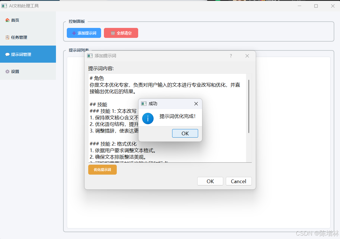 提示词管理模块允许用户创建和管理用于文档处理的提示词模板。