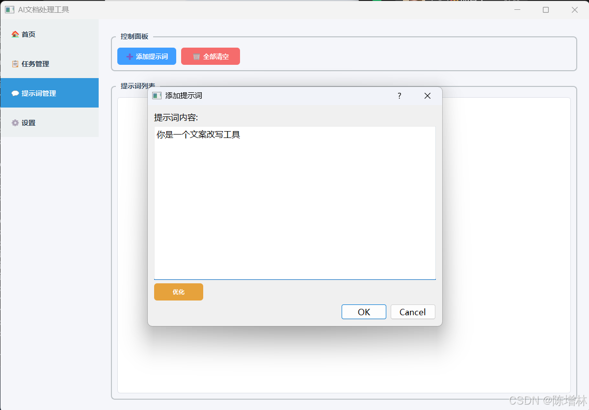 - 添加提示词:用户可以通过点击"添加提示词"按钮,输入并保存新的提示词。