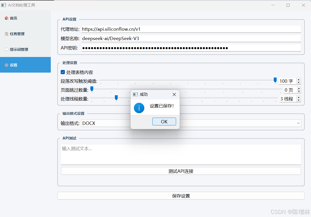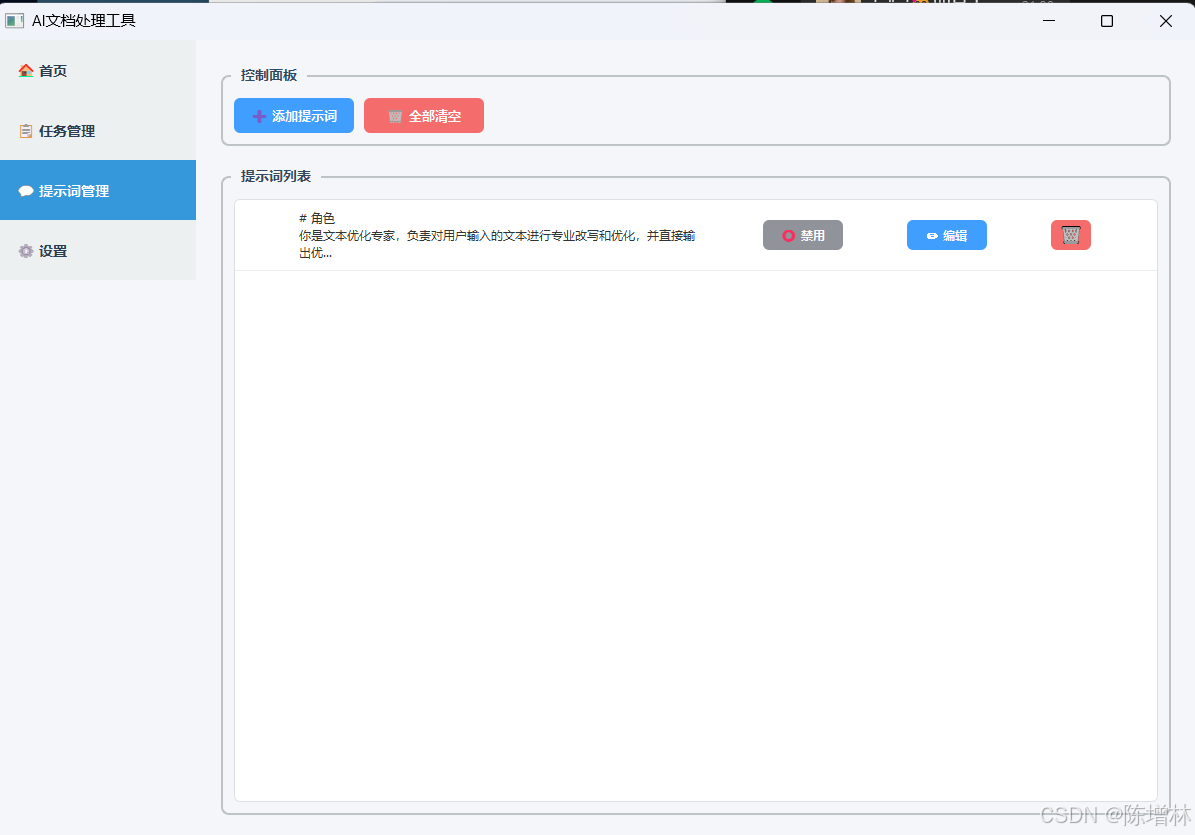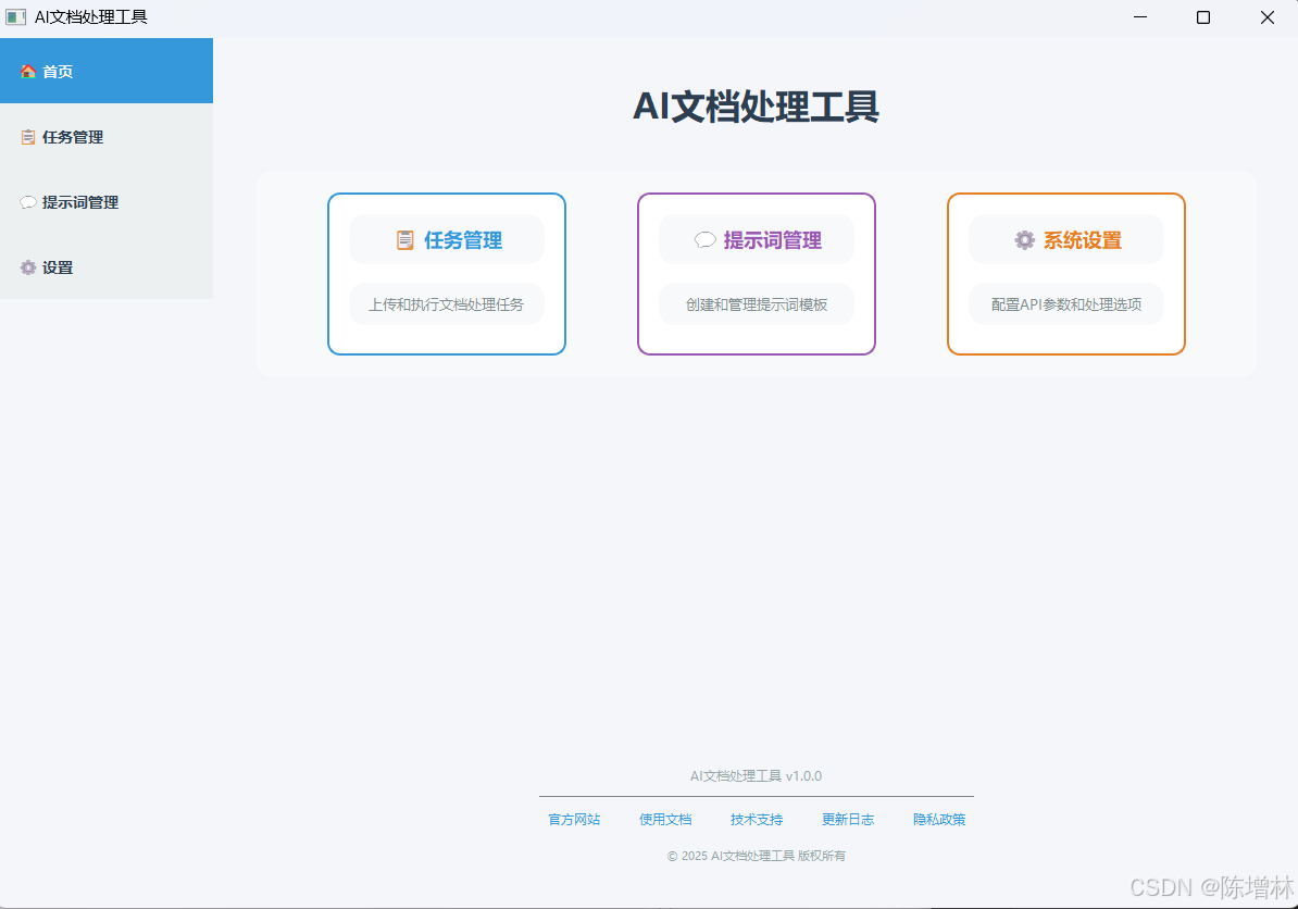 AI文档处理工具是一款专为提高文档处理效率而设计的软件。它集成了任务管理、提示词管理和系统设置三大核心功能,旨在通过人工智能技术简化文档处理流程,帮助用户更高效地管理和操作文档。