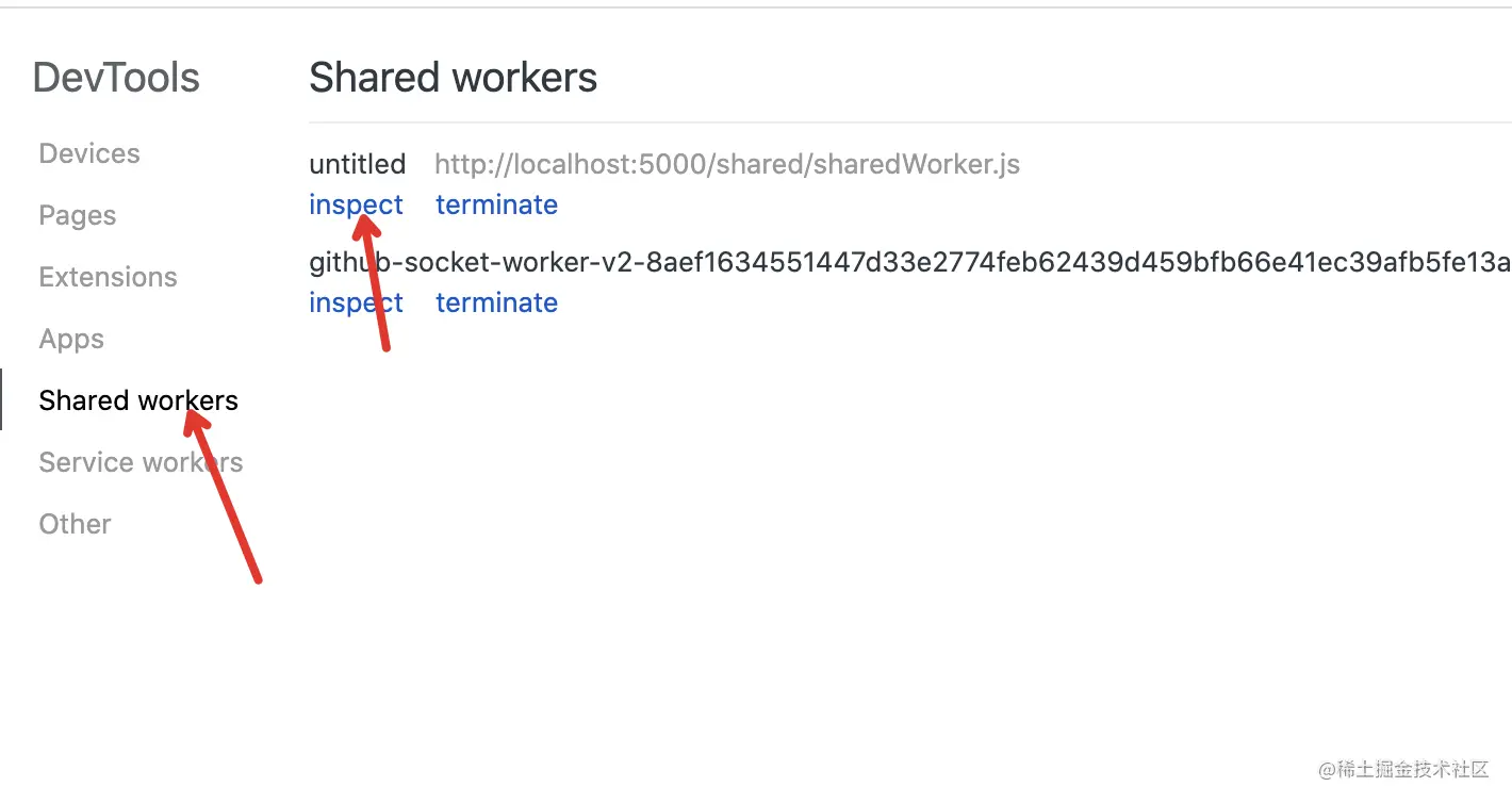 在 sharedWorker 线程里使用 console 打印信息,不会出现在主线程的的控制台中。如果你想调试 sharedWorker,需要在 Chrome 浏览器输入 chrome://inspect/ ,这里能看到所有正在运行的 sharedWorker,然后开启一个独立的 dev-tool 面板。