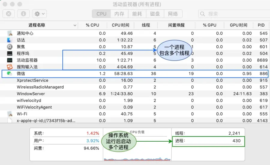 通过上图可知,我们常用的软件,比如微信和搜狗输入法都是一个独立的进程,拥有不同的 PID(进程 ID),而且图中的每个进程都含有多个线程,以微信进程为例,它就含有 「36」 个线程。那么什么是进程和线程呢?下面我们来介绍进程和线程的概念。