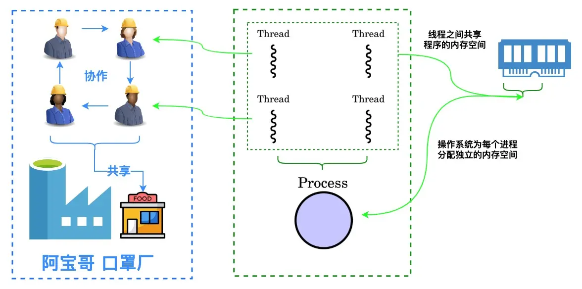 如上图所示,进程是一个工厂,它有独立的资源,线程是工厂中的工人,多个工人协作完成任务,工人之间共享工厂内的资源,比如工厂内的食堂或餐厅。此外,工厂(进程)与工厂(进程)之间是相互独立的。为了让大家能够更直观地理解进程与线程的区别,我们继续来看张图: