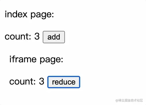 结果可以发现,index 页面和 iframe 页面的 count 始终保持一致,实现了多个页面数据同步。