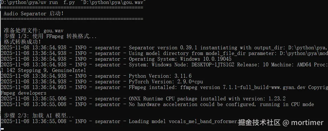 audio-separator: 一个封装了 MDX-Net、Demucs 等多种先进Spleeter模型的Python库,源于 Ultimate Vocal Remover (UVR) 的核心技术。uv: 一个极速 Python 打包和解析器,可作为pip和venv的替代品。在此方案中,我们利用其uv run功能,创建了一个"脚本即环境"的体验。FFmpeg: 音视频处理的瑞士军刀,用于将不同格式的输入文件标准化,作为模型处理的前置步骤。- ONNX Runtime: 作为AI模型的推理引擎,提供跨平台的CPU/GPU高效运算能力。