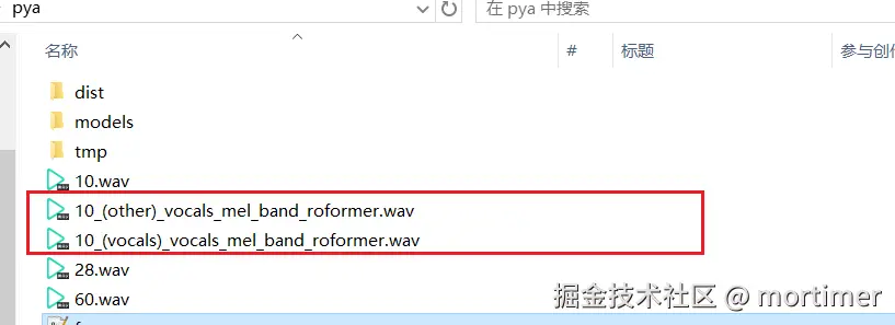 [原始文件名]_(Vocals)_... .wav: 分离出的人声。[原始文件名]_(Other)_... .wav: 分离出的伴奏/背景声。