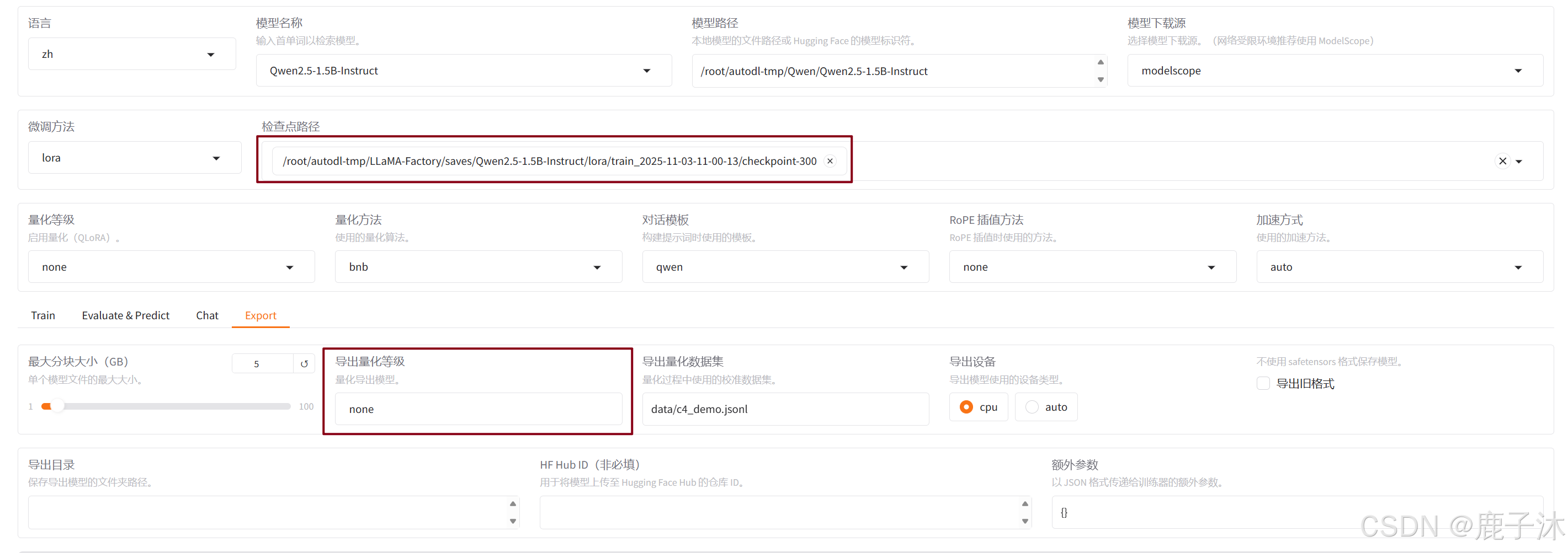 如果在检查点路径中选的是没有导出的权重文件,那么导出量化等级是不可以选择的。