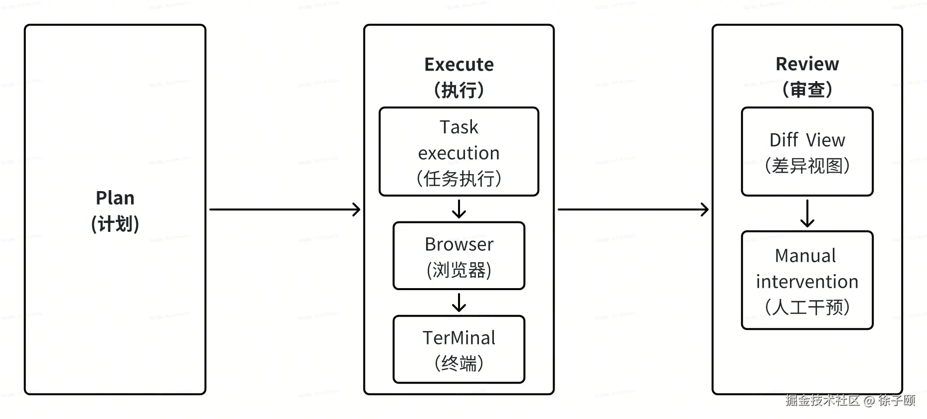- 修订: 任务完成后,它会用"Diff"视图展示所有变更,供你审查。