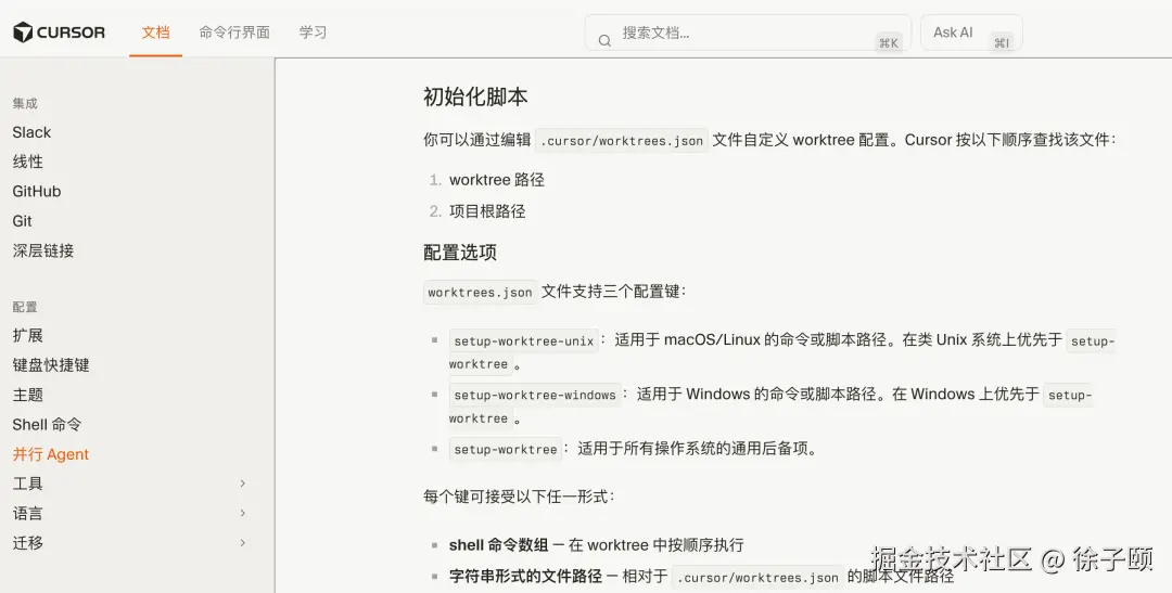 - 还有个小细节,默认创建的 worktrees 只有代码文件,没有 node_modules 等依赖。如果你的项目需要,可以配置一下初始化脚本,让每个 AI 工作区都自动装好依赖、配置好环境,而不只是光秃秃的代码。