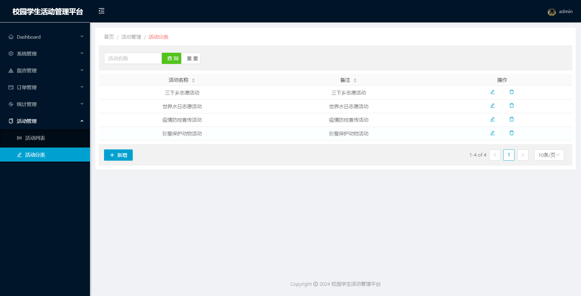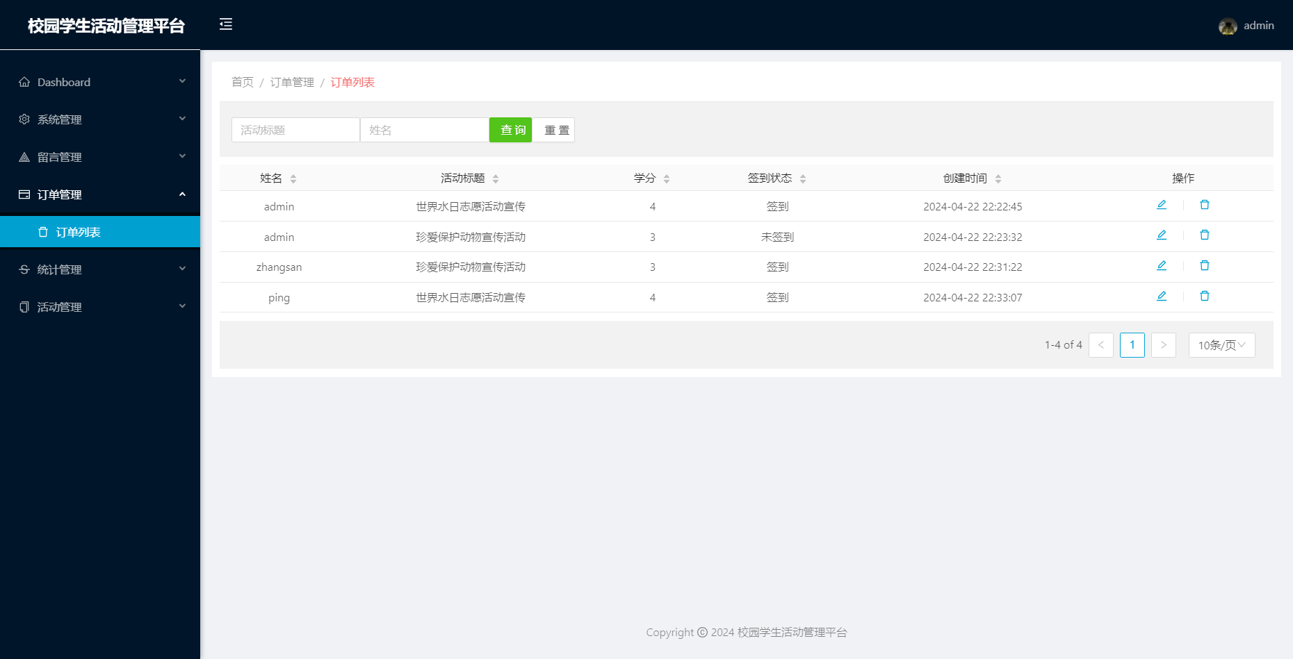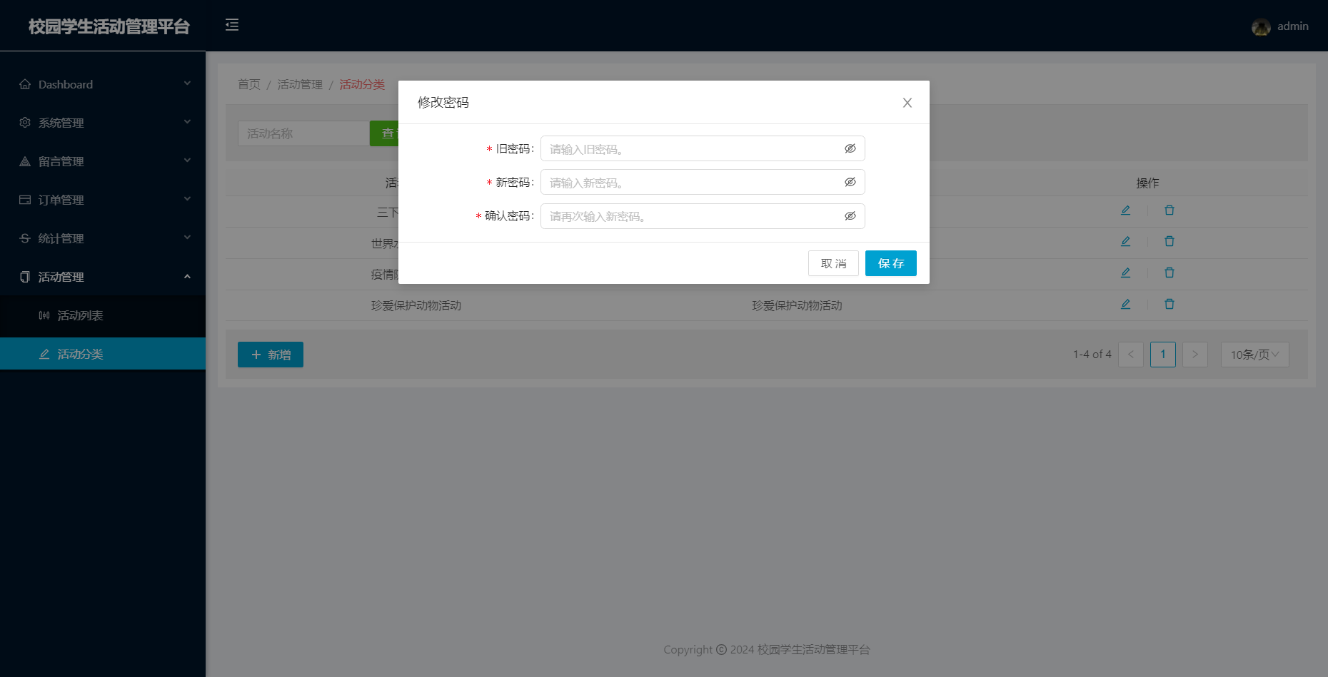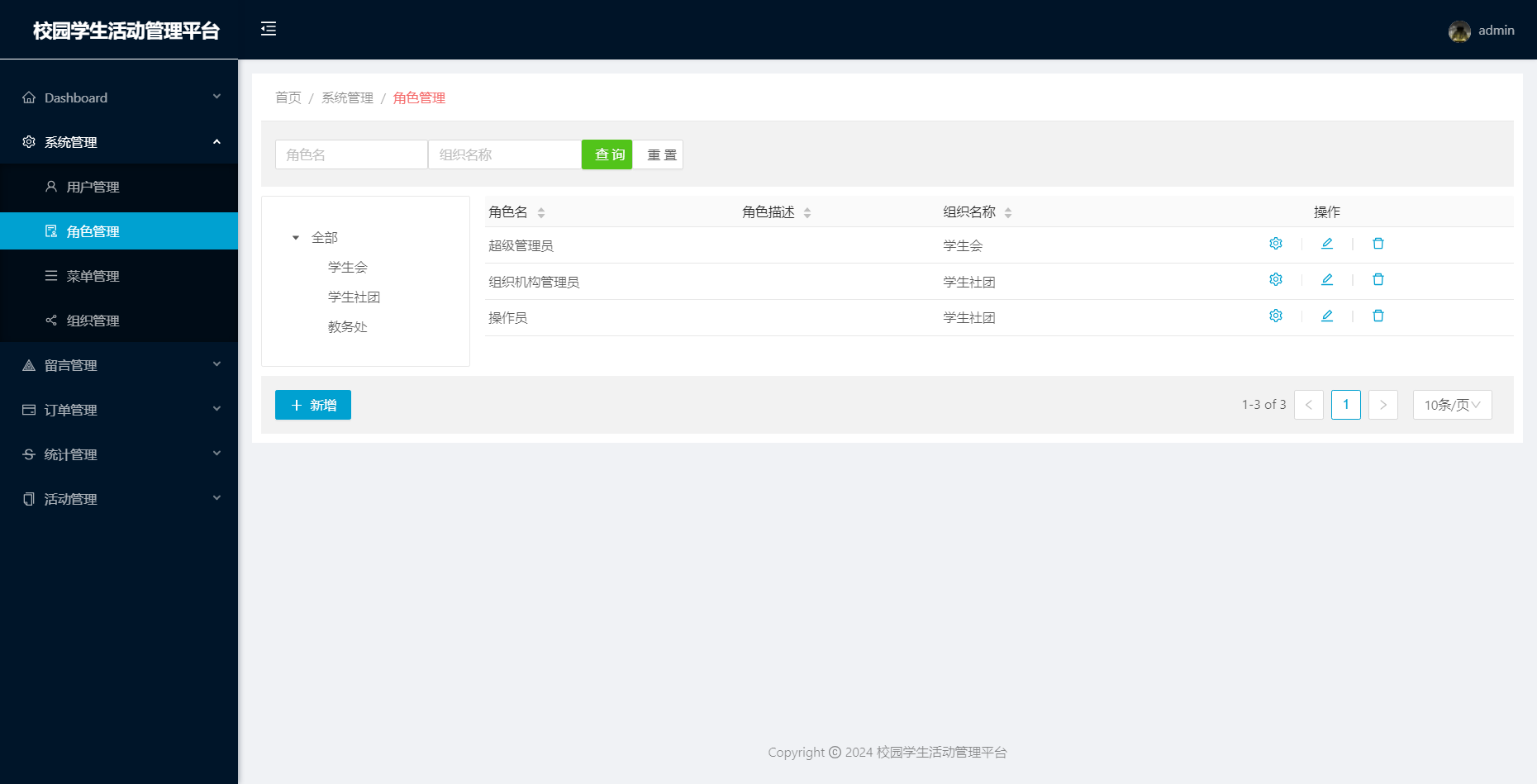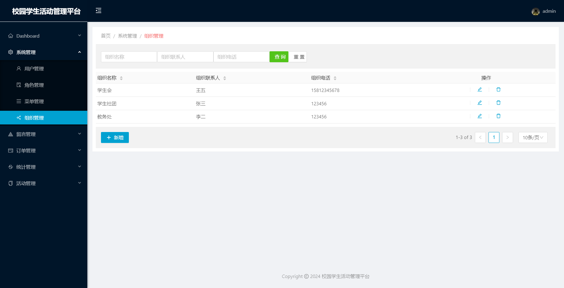 登录、修改密码、退出登录、首页、系统管理(用户管理、角色管理、菜单管理、组织管理)、留言管理、订单管理、统计管理、活动管理