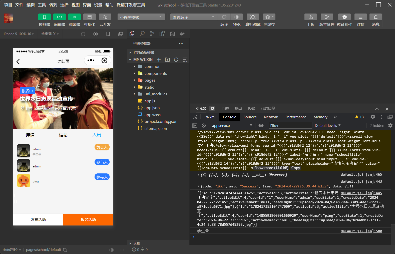 登录、注册、首页、推荐活动、轮播图、活动详情、搜索活动、报名活动、发布活动,个人资料、修改密码、参与活动、学分统计、退出账号等等