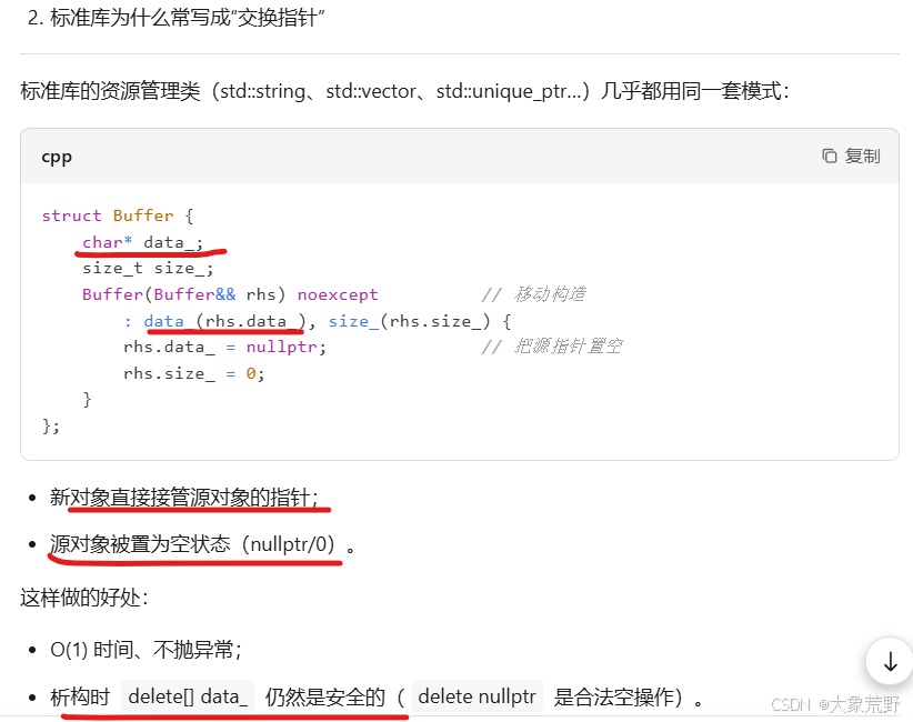 | 资源开销 | 深复制,O(n) 内存/系统调用 | 仅交换指针,O(1) |