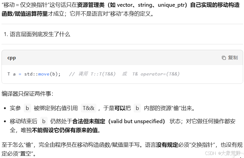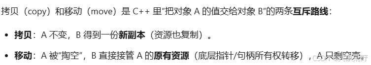 | 源对象状态 | 保持不变 | 被"搬空"(合法但未指定),源值不保证是原样 |