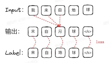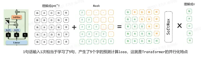 那么,它是如何学习的呢?在自注意力机制中,通过为 qk 增加掩码,softmax 后将负无穷对应到 0,隐藏掉 n 字符以后的内容。这样,输出的第 n+1 个字符只能关注到前 n 个字符,如同戴上了一副"只看过去"的眼镜。
