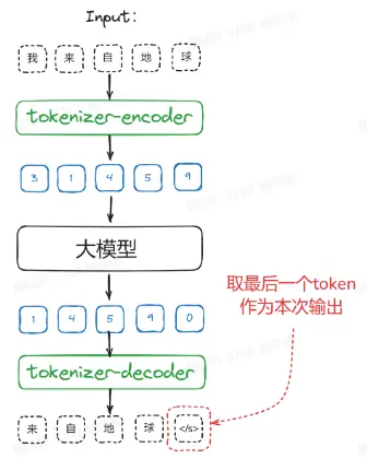 大模型的输入是由数字组成的张量,而非自然语言字符。自然语言通过 tokenizer(可以理解为一种词典)映射到词典的页码数字 ID,进行输入计算。得到的输出数字再利用词典进行解码,重新得到自然语言。