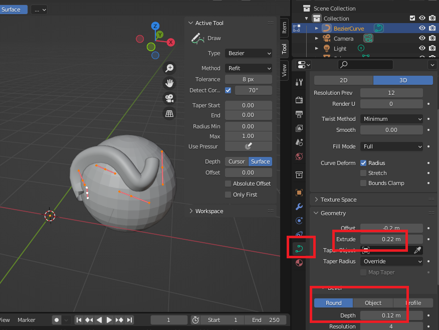12.如需将曲线转换为管状模型,可在如下页签下找到Geometry-Extrude进行挤出操作,Round页签下也可进行一些设置。