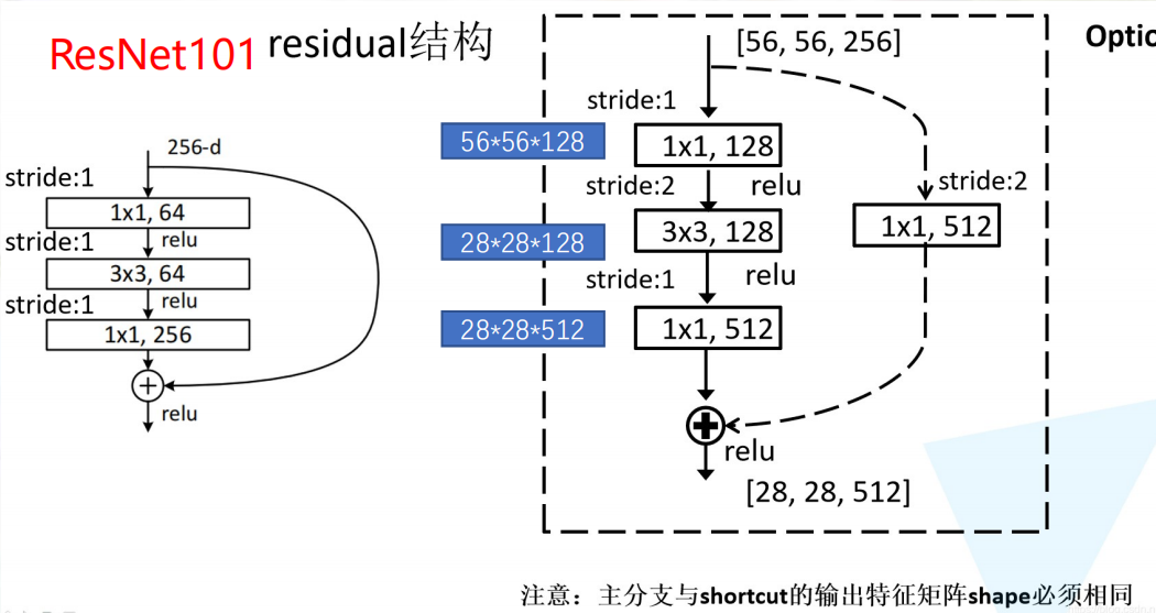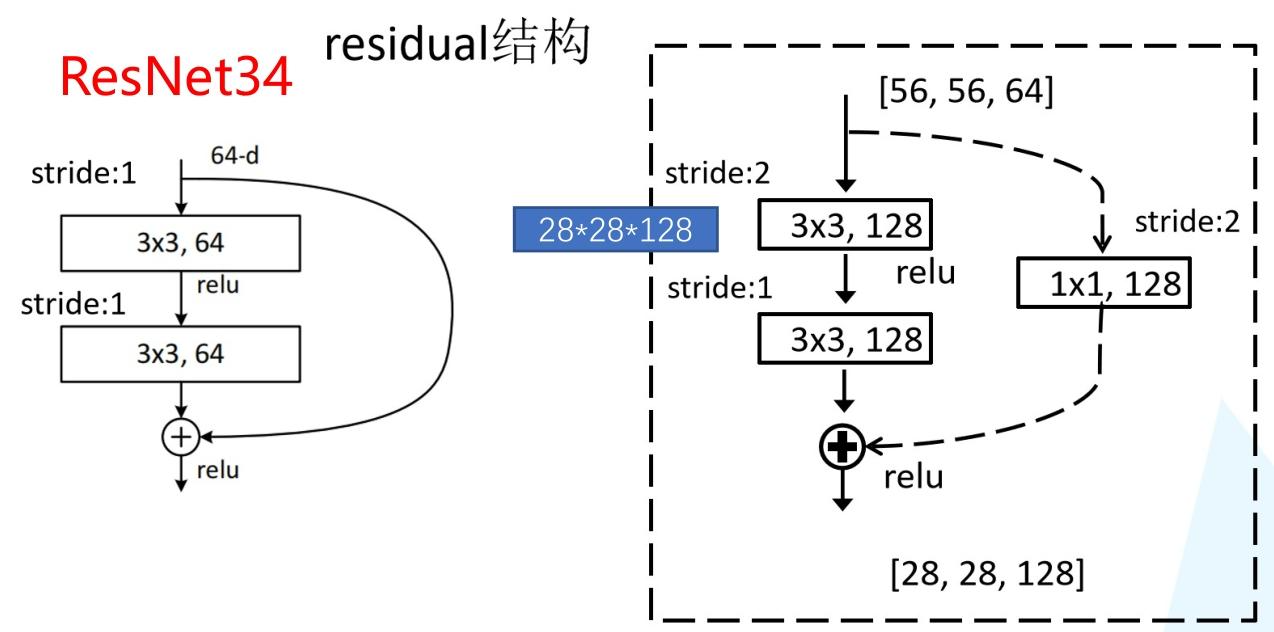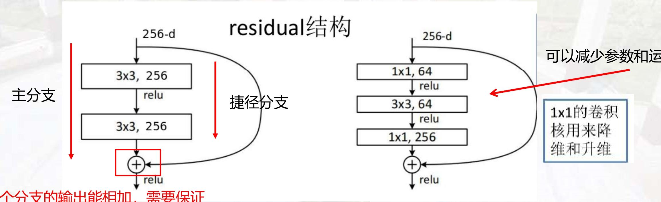- 维度匹配:当残差块需要改变空间尺寸或通道数时,捷径分支会引入1×1卷积(步长为2)来保证维度一致。