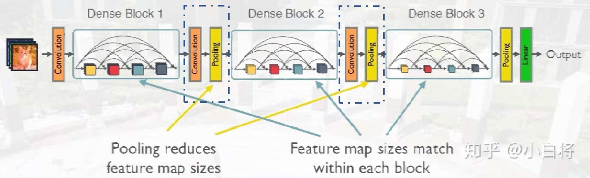 | BN+ReLU+1x1 Conv+2x2 AvgPooling | 过渡层(Transition Layer) | 连接两个Dense Block,通过1x1 Conv压缩通道数,2x2 AvgPooling下采样减少空间维度,控制网络规模 | Dense Block之间的连接层 |