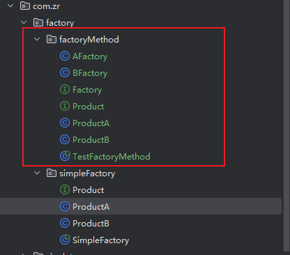 - Product接口,ProductA类,ProductB类和简单工厂是一样的,这里我就不贴重复代码了,代码结构如下