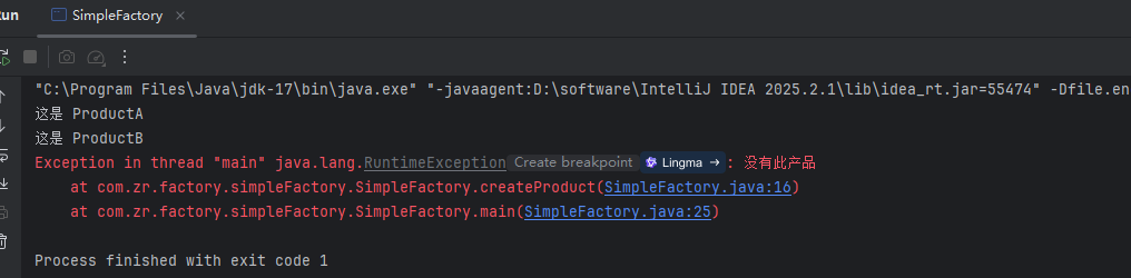 - 定义一个AFactory类,实现Factory接口,并且重写createProduct方法,用于创建产品A
