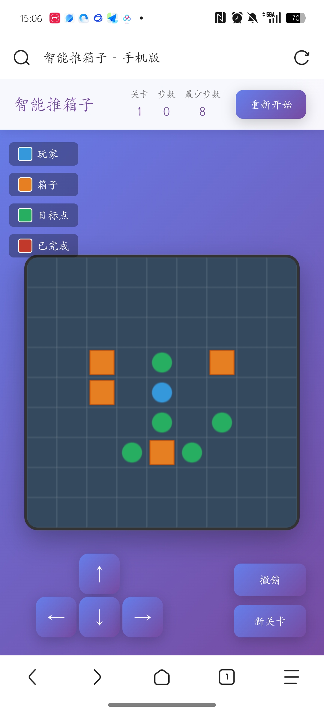 array\[i\], array\[j\]\] = \[array\[j\], array\[i\]\]; } } // 10. 计算最少步数 calculateMinMoves() { let boxCount = 0; for (let y = 0; y \< this.gameBoard.length; y++) { for (let x = 0; x \< this.gameBoard\[y\].length; x++) { if (this.gameBoard\[y\]\[x\] === CONFIG.elements.box \|\| this.gameBoard\[y\]\[x\] === CONFIG.elements.boxOnTarget) { boxCount++; } } } return boxCount \* 2; } // 11. 绘制游戏 draw() { // 1. 清空画布 this.ctx.fillStyle = CONFIG.colors.floor; this.ctx.fillRect(0, 0, this.canvas.width, this.canvas.height); // 2. 计算箱子内边距 const boxPadding = Math.max(2, this.cellSize \* 0.1); // 3. 绘制游戏元素 for (let y = 0; y \< this.gameBoard.length; y++) { for (let x = 0; x \< this.gameBoard\[y\].length; x++) { const element = this.gameBoard\[y\]\[x\]; const px = x \* this.cellSize; const py = y \* this.cellSize; switch(element) { case CONFIG.elements.wall: this.ctx.fillStyle = CONFIG.colors.wall; this.ctx.fillRect(px, py, this.cellSize, this.cellSize); this.ctx.strokeStyle = '#1a252f'; this.ctx.strokeRect(px, py, this.cellSize, this.cellSize); break; case CONFIG.elements.floor: this.ctx.fillStyle = CONFIG.colors.floor; this.ctx.fillRect(px, py, this.cellSize, this.cellSize); break; case CONFIG.elements.target: this.ctx.fillStyle = CONFIG.colors.floor; this.ctx.fillRect(px, py, this.cellSize, this.cellSize); this.ctx.fillStyle = CONFIG.colors.target; this.ctx.beginPath(); this.ctx.arc(px + this.cellSize/2, py + this.cellSize/2, this.cellSize/3, 0, Math.PI \* 2); this.ctx.fill(); break; case CONFIG.elements.box: this.ctx.fillStyle = CONFIG.colors.floor; this.ctx.fillRect(px, py, this.cellSize, this.cellSize); this.ctx.fillStyle = CONFIG.colors.box; this.ctx.fillRect(px + boxPadding, py + boxPadding, this.cellSize - boxPadding \* 2, this.cellSize - boxPadding \* 2); this.ctx.strokeStyle = '#d35400'; this.ctx.strokeRect(px + boxPadding, py + boxPadding, this.cellSize - boxPadding \* 2, this.cellSize - boxPadding \* 2); break; case CONFIG.elements.boxOnTarget: this.ctx.fillStyle = CONFIG.colors.floor; this.ctx.fillRect(px, py, this.cellSize, this.cellSize); this.ctx.fillStyle = CONFIG.colors.target; this.ctx.beginPath(); this.ctx.arc(px + this.cellSize/2, py + this.cellSize/2, this.cellSize/3, 0, Math.PI \* 2); this.ctx.fill(); this.ctx.fillStyle = CONFIG.colors.boxOnTarget; this.ctx.fillRect(px + boxPadding, py + boxPadding, this.cellSize - boxPadding \* 2, this.cellSize - boxPadding \* 2); break; case CONFIG.elements.player: this.ctx.fillStyle = CONFIG.colors.floor; this.ctx.fillRect(px, py, this.cellSize, this.cellSize); this.ctx.fillStyle = CONFIG.colors.player; this.ctx.beginPath(); this.ctx.arc(px + this.cellSize/2, py + this.cellSize/2, this.cellSize/3, 0, Math.PI \* 2); this.ctx.fill(); break; case CONFIG.elements.playerOnTarget: this.ctx.fillStyle = CONFIG.colors.floor; this.ctx.fillRect(px, py, this.cellSize, this.cellSize); this.ctx.fillStyle = CONFIG.colors.target; this.ctx.beginPath(); this.ctx.arc(px + this.cellSize/2, py + this.cellSize/2, this.cellSize/3, 0, Math.PI \* 2); this.ctx.fill(); this.ctx.fillStyle = CONFIG.colors.playerOnTarget; this.ctx.beginPath(); this.ctx.arc(px + this.cellSize/2, py + this.cellSize/2, this.cellSize/4, 0, Math.PI \* 2); this.ctx.fill(); break; } // 绘制网格线 this.ctx.strokeStyle = 'rgba(255, 255, 255, 0.1)'; this.ctx.strokeRect(px, py, this.cellSize, this.cellSize); } } } // 12. 移动玩家 movePlayer(dx, dy) { // 1. 检查游戏是否完成 if (this.isComplete) return; // 2. 计算新位置 const newX = this.playerPos.x + dx; const newY = this.playerPos.y + dy; // 3. 检查边界 if (newX \< 0 \|\| newX \>= this.gridSize \|\| newY \< 0 \|\| newY \>= this.gridSize) { return; } // 4. 获取目标位置元素 const targetCell = this.gameBoard\[newY\]\[newX\]; // 5. 检查是否是墙 if (targetCell === CONFIG.elements.wall) { return; } // 6. 保存历史状态 this.saveHistory(); // 7. 检查是否推箱子 if (targetCell === CONFIG.elements.box \|\| targetCell === CONFIG.elements.boxOnTarget) { const boxNewX = newX + dx; const boxNewY = newY + dy; // 检查箱子能否移动 if (boxNewX \< 0 \|\| boxNewX \>= this.gridSize \|\| boxNewY \< 0 \|\| boxNewY \>= this.gridSize \|\| this.gameBoard\[boxNewY\]\[boxNewX\] === CONFIG.elements.wall \|\| this.gameBoard\[boxNewY\]\[boxNewX\] === CONFIG.elements.box \|\| this.gameBoard\[boxNewY\]\[boxNewX\] === CONFIG.elements.boxOnTarget) { this.history.pop(); // 撤销历史记录 return; } // 移动箱子 const boxOnTarget = this.gameBoard\[boxNewY\]\[boxNewX\] === CONFIG.elements.target; this.gameBoard\[boxNewY\]\[boxNewX\] = boxOnTarget ? CONFIG.elements.boxOnTarget : CONFIG.elements.box; // 更新箱子原位置 const wasOnTarget = targetCell === CONFIG.elements.boxOnTarget; this.gameBoard\[newY\]\[newX\] = wasOnTarget ? CONFIG.elements.target : CONFIG.elements.floor; } // 8. 移动玩家 const playerOnTarget = this.gameBoard\[newY\]\[newX\] === CONFIG.elements.target; this.gameBoard\[this.playerPos.y\]\[this.playerPos.x\] = (this.gameBoard\[this.playerPos.y\]\[this.playerPos.x\] === CONFIG.elements.playerOnTarget) ? CONFIG.elements.target : CONFIG.elements.floor; this.gameBoard\[newY\]\[newX\] = playerOnTarget ? CONFIG.elements.playerOnTarget : CONFIG.elements.player; this.playerPos = { x: newX, y: newY }; // 9. 更新步数 this.moves++; this.updateUI(); // 10. 检查是否完成 if (this.checkWin()) { setTimeout(() =\> { if (this.checkWin()) { this.onLevelComplete(); } }, 100); } // 11. 重绘 this.draw(); } // 13. 保存历史状态 saveHistory() { const state = { board: this.gameBoard.map(row =\> \[...row\]), playerPos: { ...this.playerPos }, moves: this.moves }; this.history.push(state); // 限制历史记录长度 if (this.history.length \> 50) { this.history.shift(); } } // 14. 撤销操作 undo() { if (this.history.length === 0 \|\| this.isComplete) return; const state = this.history.pop(); this.gameBoard = state.board; this.playerPos = state.playerPo