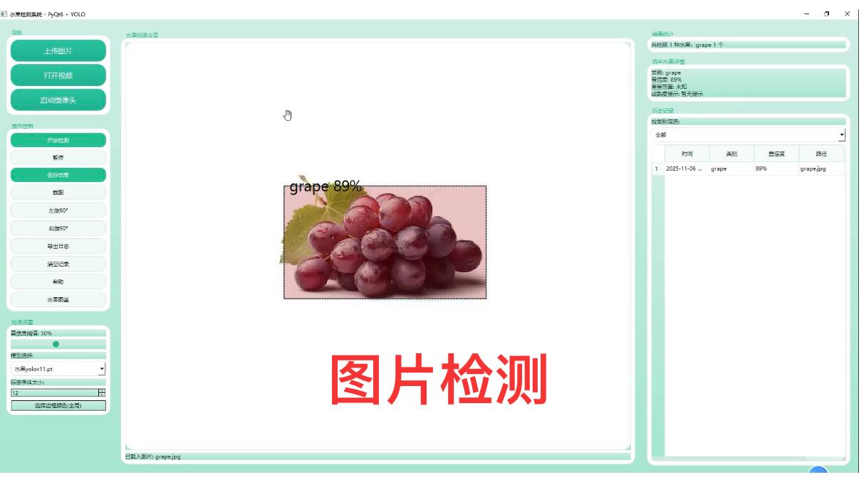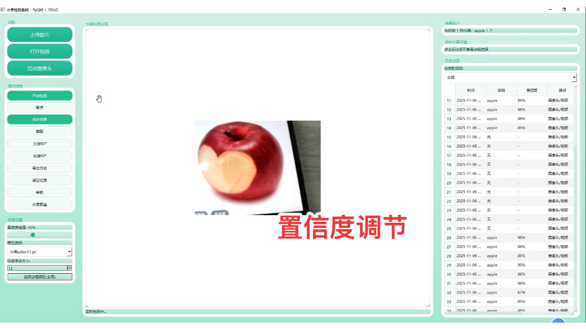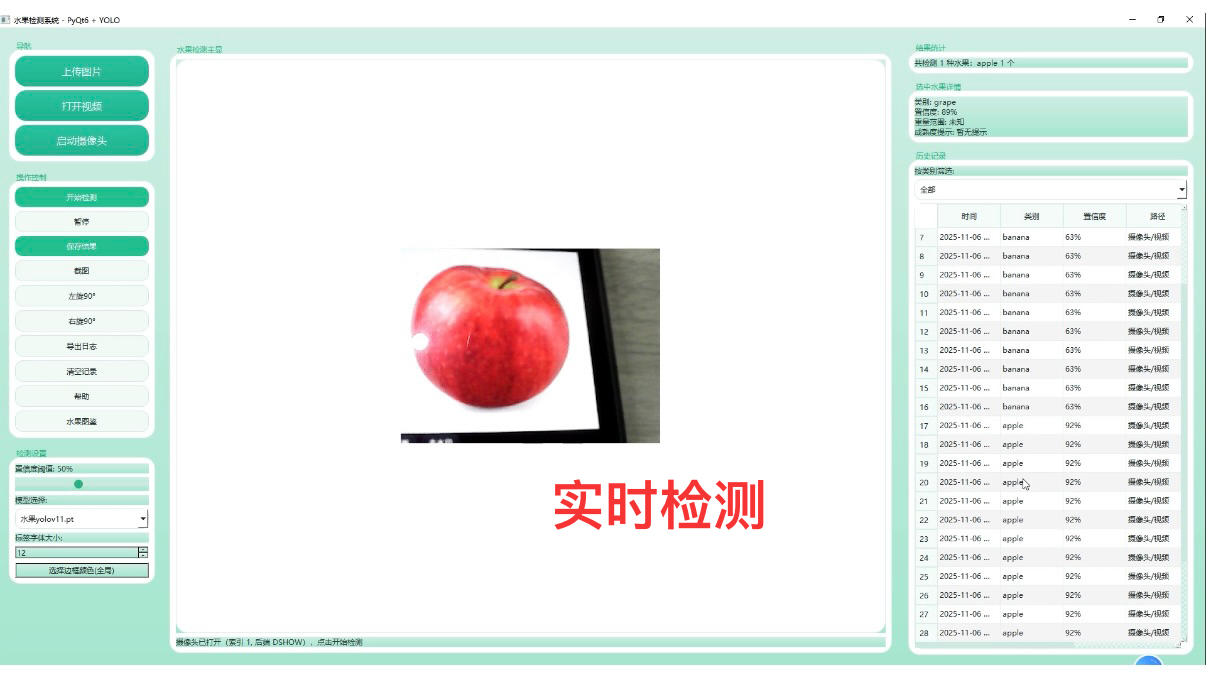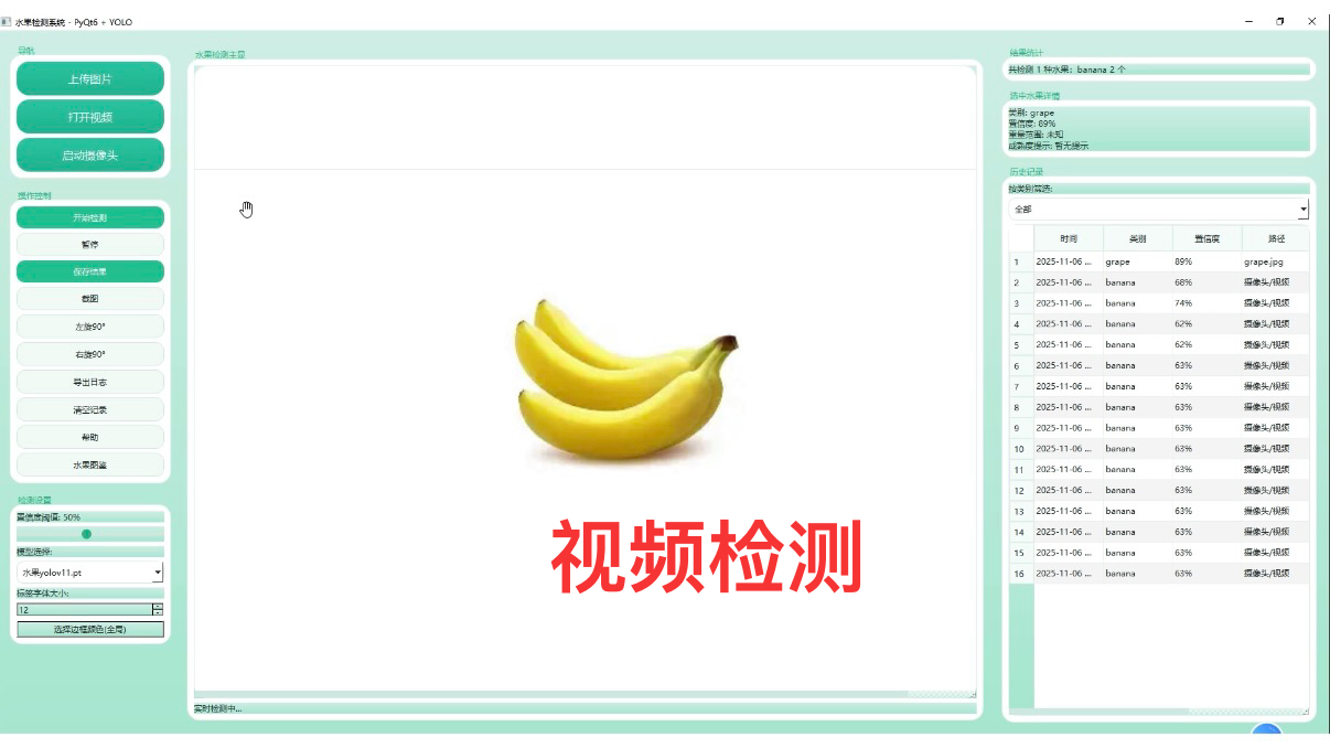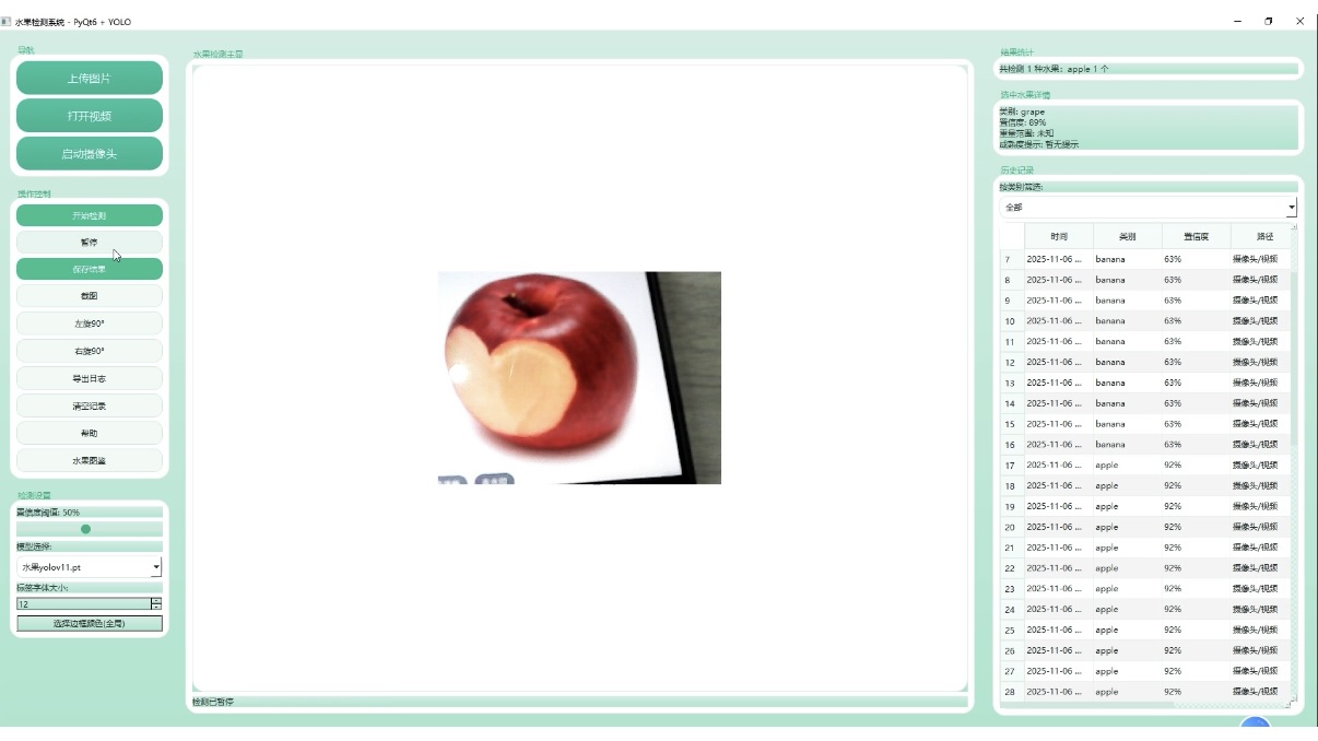 该系统整合了当前热门的目标检测、UI 开发与视频处理技术,代码结构清晰,注释完善,适合计算机专业学生作为课程设计、毕业设计的参考项目。通过该项目可深入学习 YOLO11 模型的实际应用、PyQt6 界面开发、OpenCV 视频处理等核心技能,同时掌握多框架整合的工程化思路。此外,系统可直接应用于水果品质检测、数量统计等实际场景,具备一定的工程应用价值。