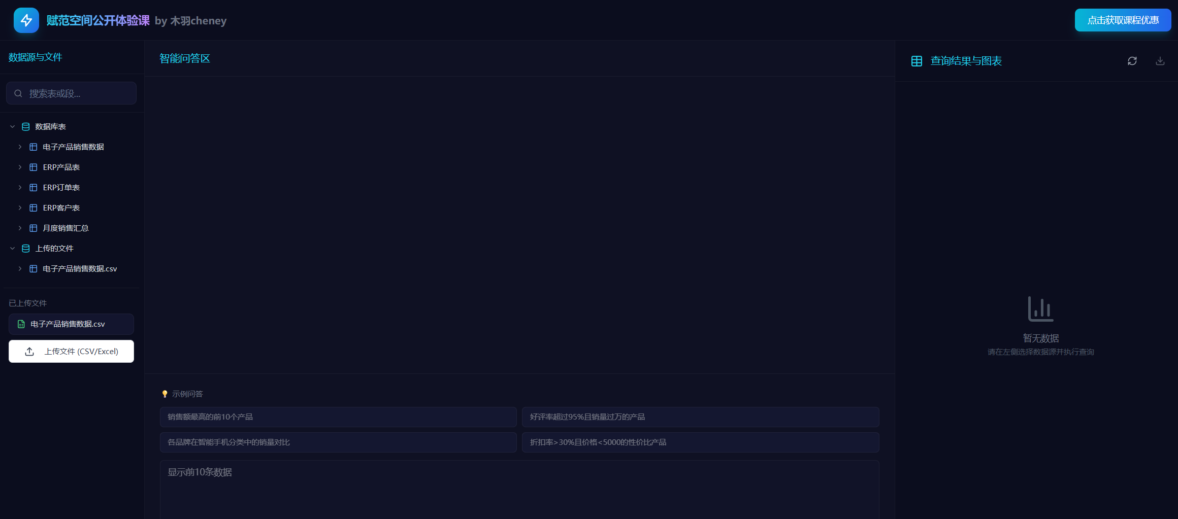 我们将使用LangChain 1.0的ReAct Agent架构,结合FastAPI后端和React前端,构建一个完整的智能SQL问答系统。该系统支持自然语言查询数据库表和CSV文件,并自动生成数据分析报告和可视化图表。
