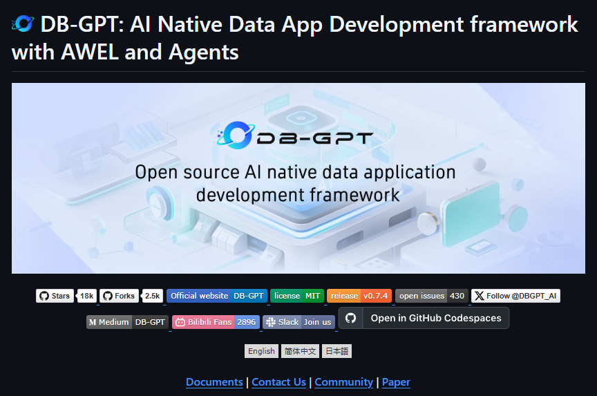 DB-GPT 由中国开源组织 eosphoros-ai 发起,是一个 AI-Native 数据应用开发框架,目标是让 LLM 能直接理解和操作数据库、数据仓库、Excel 等多源数据。