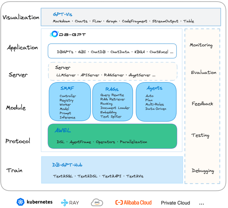 DB-GPT 的多层架构完整覆盖了从 数据交互 → 语义理解 → 模型生成 → 结果展示 → 反馈优化 的全过程,堪称企业级 AI 数据交互的标杆。