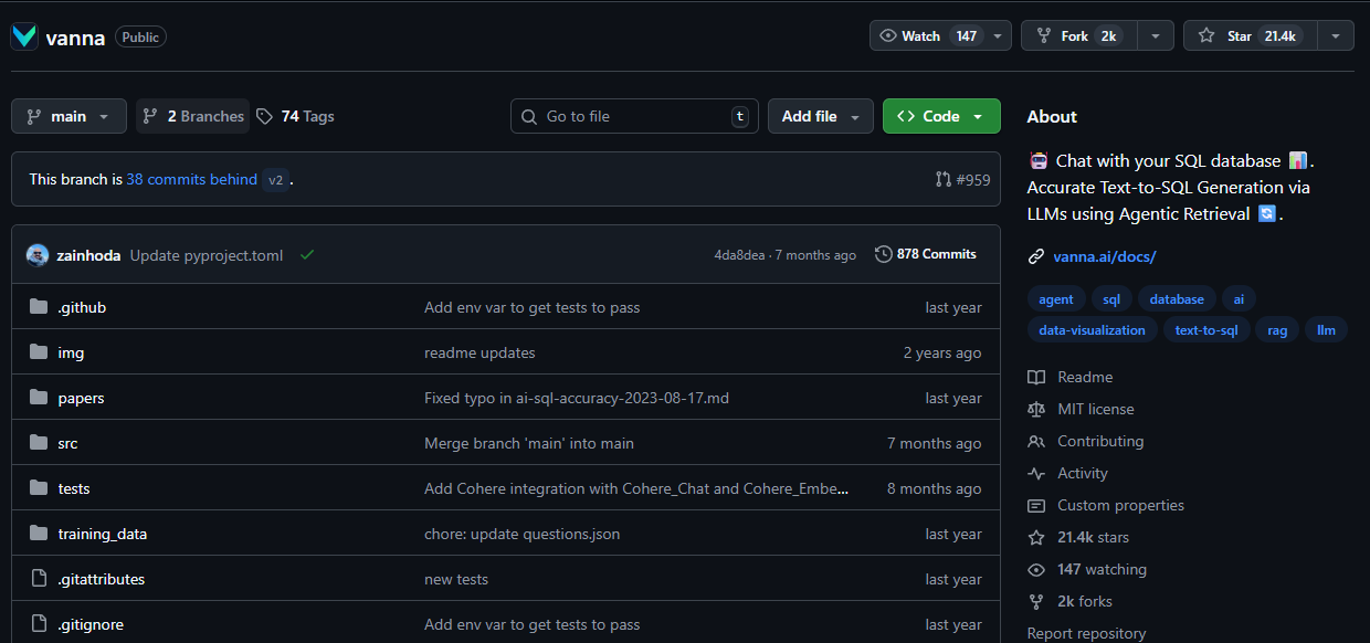 Vanna 是一个非常轻量的 Text-to-SQL Agent 框架,允许用户通过自然语言直接查询数据库。