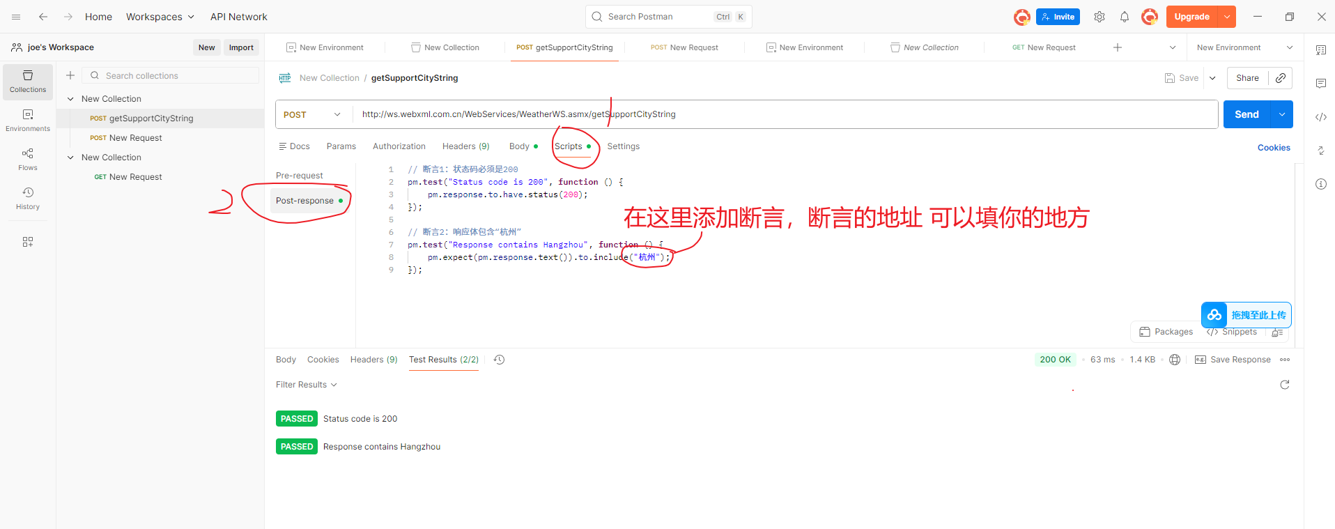 pm.expect(pm.response.text()).to.include("杭州");