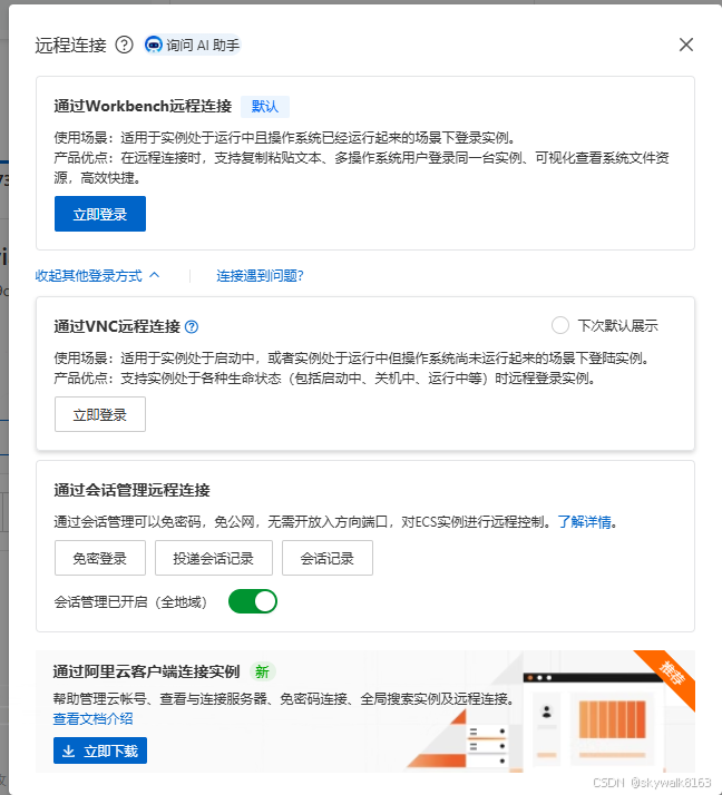 登录系统跟3年前进行了改变,没有完全虚拟控制台了(就是可以看到内核启动的那个控制台),只有vnc和Workbench等。奥,我理解错误了,我把vnc理解成xwindow和windows的那个3389段鸥的vnc了,原来阿里云还是有以前的那种虚拟控制台的,vnc就是。