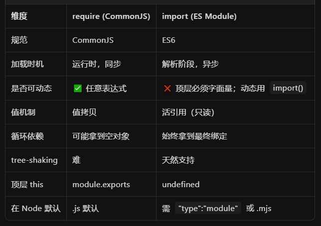 Node 混用记住:ESM 可引 CJS,CJS 只能动态 import() 引 ESM。